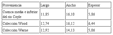 El 79,48% (n = 31) de las puntas de proyectil bajo análisis son medianas, bifaciales, triangulares con pedúnculo y, morfológicamente, se engloban en el diseño Magallanes IV (Bird, 1938; Gómez Otero, 1986-1987) (Tabla 1). A su vez, las dimensiones y formas de los pedúnculos muestran similitud con el diseño Magallanes IV espesas de la colección Wood (Franco et al., 2005), aunque más cortos y delgados. El 48,5% de los casos (n = 17) tiene un espesor superior a la media (5,68 mm) y comparten los mismos valores respecto del ancho, por lo cual todas serían asignadas a lanzas. La colección Warne tiene medidas que se diferencian de las otras dos, siendo las puntas más largas, angostas y delgadas (Franco et al., 2005) (Tabla 2). Por su parte, en el CVPA, las modificaciones en los tamaños y formas de lanzas y otras armas arrojadizas se deben al reciclado (Banegas et al., 2014: Tabla 9).