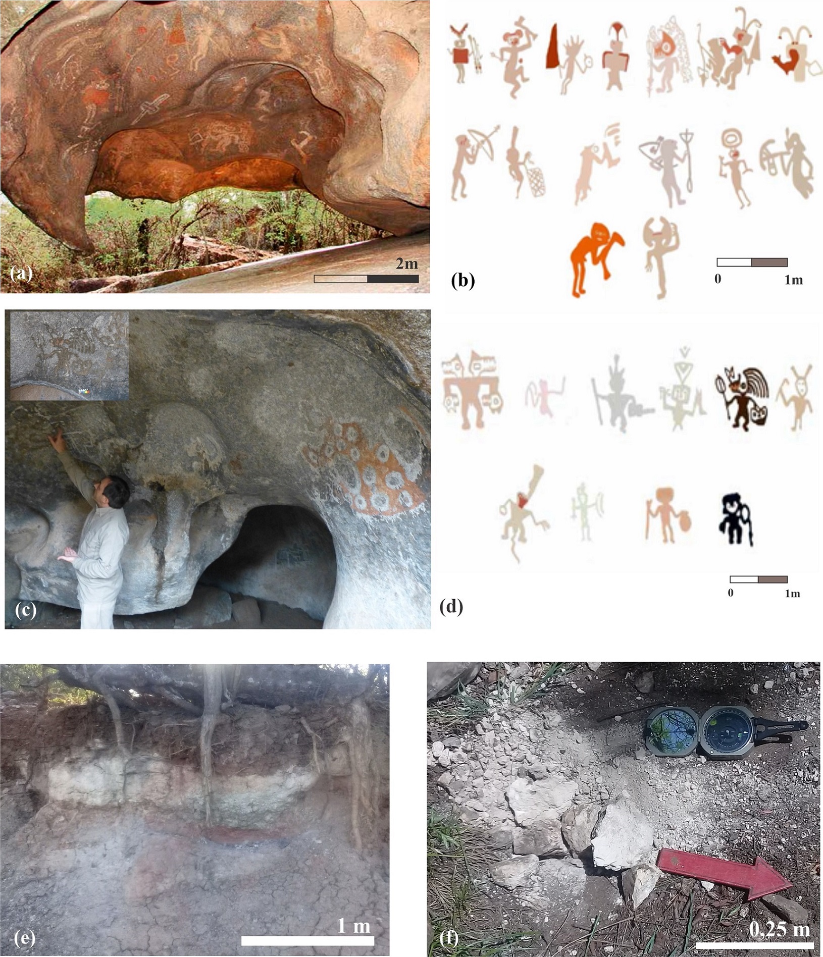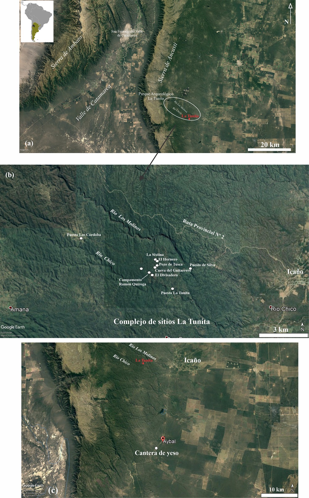 Dentro de dicha reserva, el complejo de sitios La Tunita (ubicado en la cuenca media de Ipizca-Icaño, departamento Ancasti, provincia de Catamarca), conforma una trama simbólica procedente de tiempos de la Cultura Aguada (ca. 600-1100 DC) (Aschero, 2006; Nazar et al., 2014) (Figura 1a y 1b), en la cual las grandes imágenes antropomorfas y felínicas parecen guardar relación con la función de cada uno de los abrigos; tal es el caso de La Sixtina (el alero más destacado de La Tunita) y la Cueva El Hornero (Figura 2a, 2c). El tratamiento de cada una de las imágenes en el plano estético y tecnológico nos lleva a pensar que se recurriera a recetas específicas en cuanto a la base material de las pinturas caracterizadas por los colores blancos y rojos (Figura 2b y 2d) (De La Fuente et al., 2005; Nazar et al., 2014; Nazar y De La Fuente, 2016).