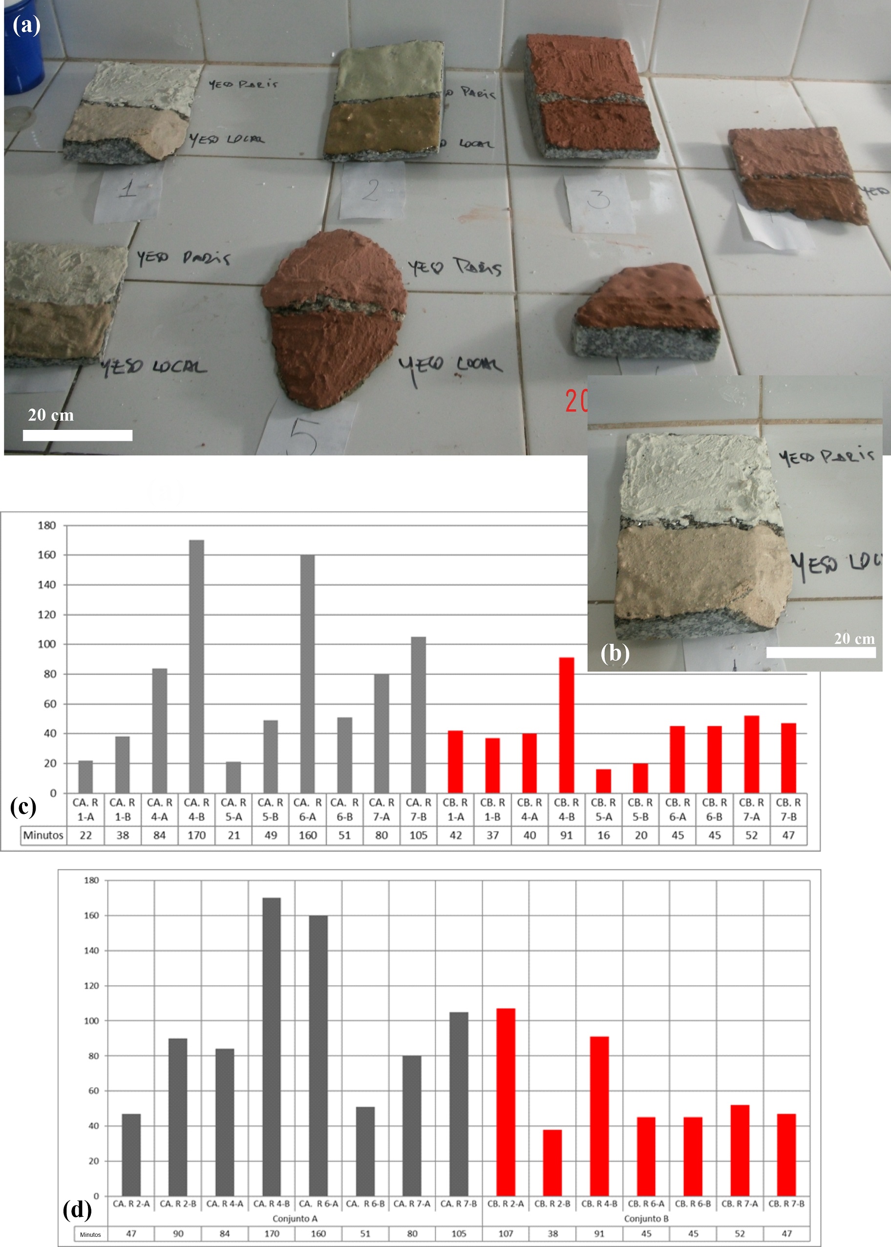 Siguiendo con el estudio del tiempo fraguado, en la Figura 4c se observa que las mezclas con baba de cactus de ambos conjuntos (A y B) no presentan diferencias significativas. Las unidades R 2-A y R 2-B de ambos conjuntos presentan mezclas de 50% de yeso y 50% de baba de cactus y presentan un poderoso efecto retardante del fraguado y el secado (Tabla 1).