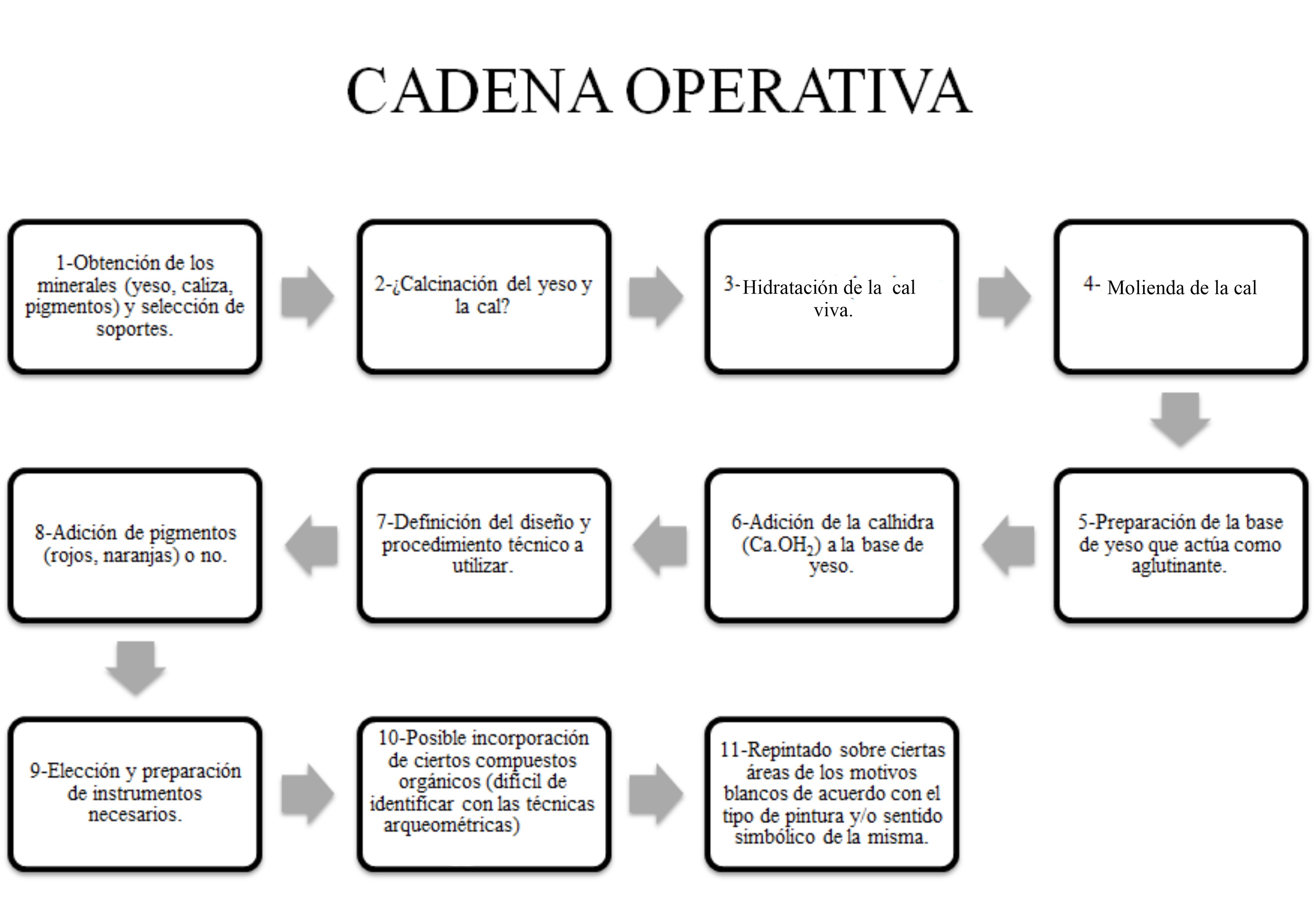 Finalmente, en base a lo expuesto anteriormente, pensamos que la producción de estas grandes pictografías debió requerir de un grado de entrenamiento y experiencia, que permiten pensar cierta especialización artesanal en los pintores Aguada. La Figura 5 presenta las diferentes etapas que conforman la cadena operativa tendencial que involucra el proceso de elaboración de la mezcla pigmentaria blanca. De ella se desprende que hay, por lo menos, tres momentos críticos en la elaboración de las pictografías: (1) la obtención de los minerales (aljez, caliza y pigmentos), (2) el pretratamiento de los minerales (molienda, calcinación y selección granulométrica) y (3) la preparación de la mezcla pigmentaria final a ser aplicada.