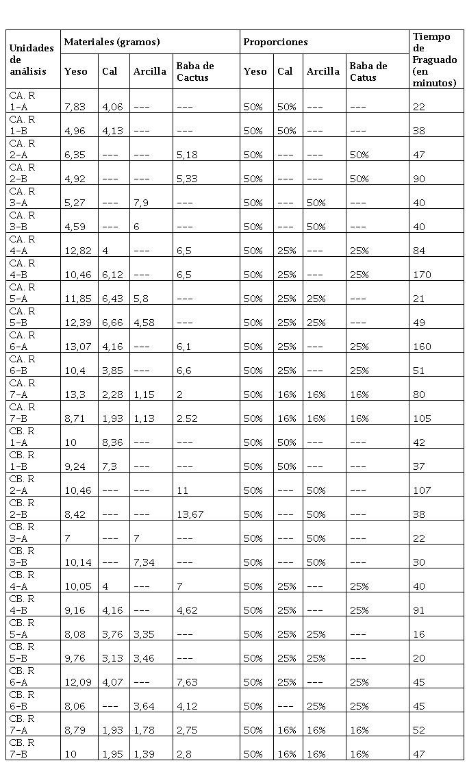 La Tabla 1 evidencia variaciones en el tiempo de fraguado en relación con las diferentes mezclas. La comparación entre los resultados de los conjuntos A y B nos permite descartar que el acondicionamiento previo incidiera significativamente en los tiempos de fraguado. Observamos que los tiempos de fraguado mayores son fruto del agregado de baba de cactus.