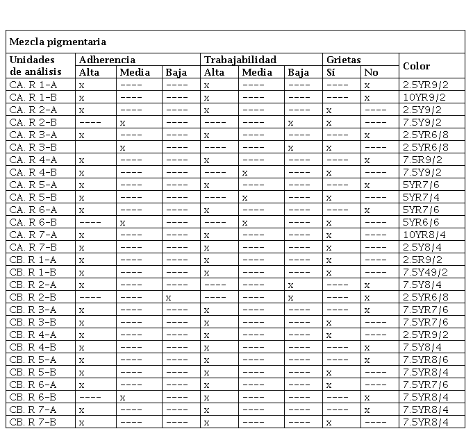 Por su parte, a escala de la pintura, la unidad de análisis es una mezcla pigmentaria en la que intervienen el yeso, la cal y la arcilla en distintas proporciones medidas en gramos. Por mezcla pigmentaria entendemos al: