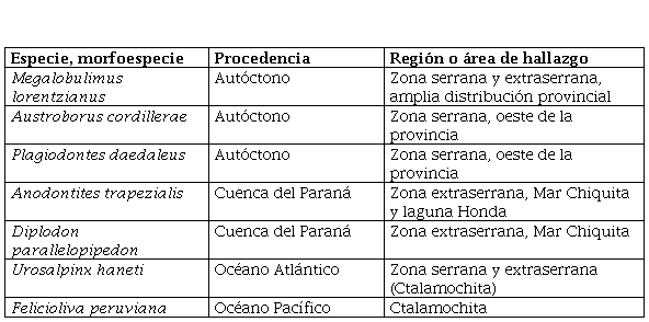Las otras dos especies terrestres que aparecen registradas en baja proporción, Plagiodontes daedaleus y Austroborus cordillerae, se corresponden con ejemplares enteros, la mayoría perforados, y que se recuperaron en la región serrana, en coincidencia o proximidad a sus respectivas áreas de distribución en vida (Pizá et al., 2006; Gordillo et al., 2015).