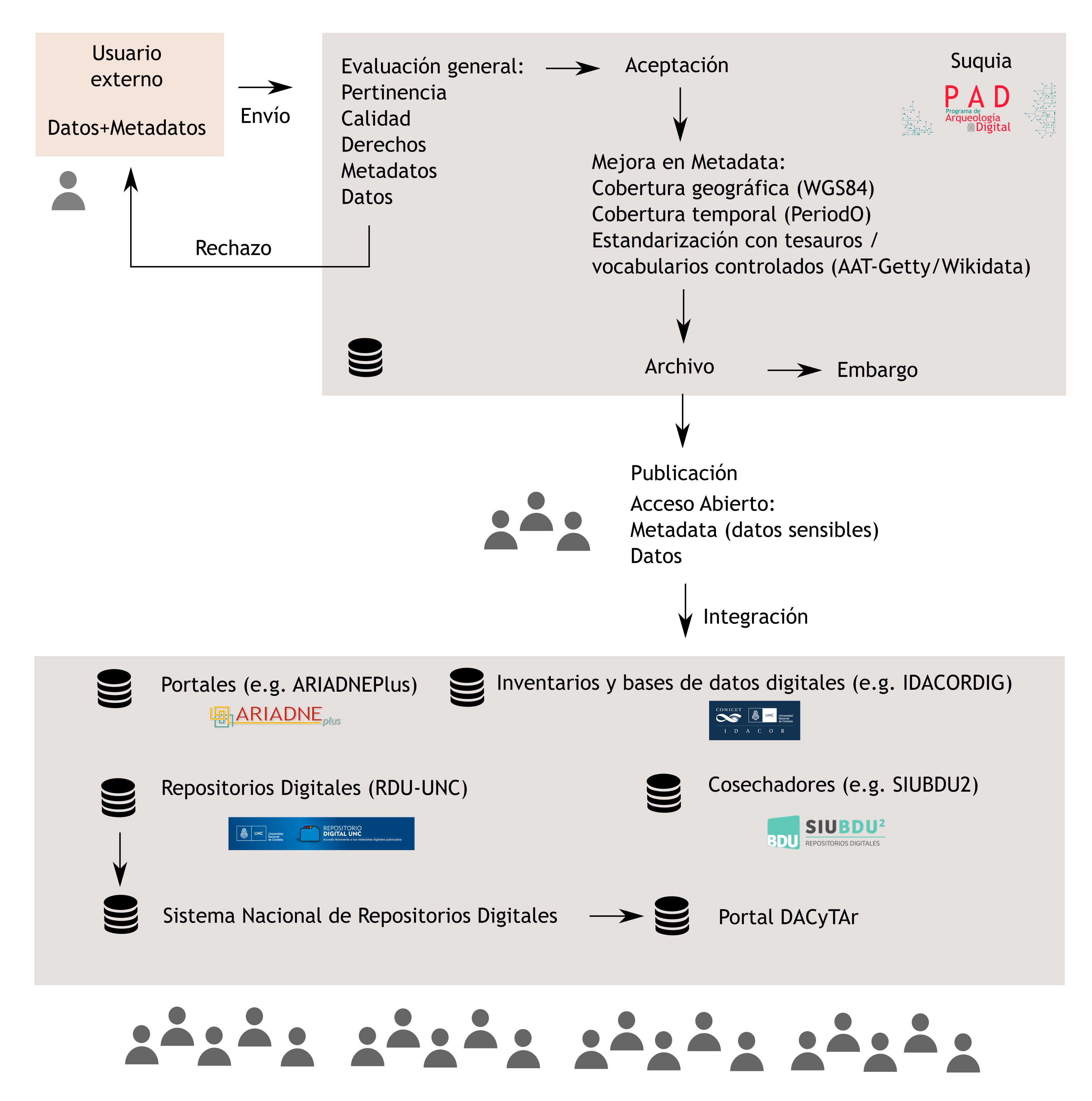 En la Figura 1 se sintetiza el flujo de trabajo para la publicación y resguardo o solo resguardo, en el caso de solicitar embargo en Suquía. También las formas posibles en que los datos pueden integrarse a otras plataformas (i.e., SIU-BDU2, Sistema Nacional de Repositorios Digitales, o el portal DACyTAr, que cosecha sus datos desde este sistema nacional).