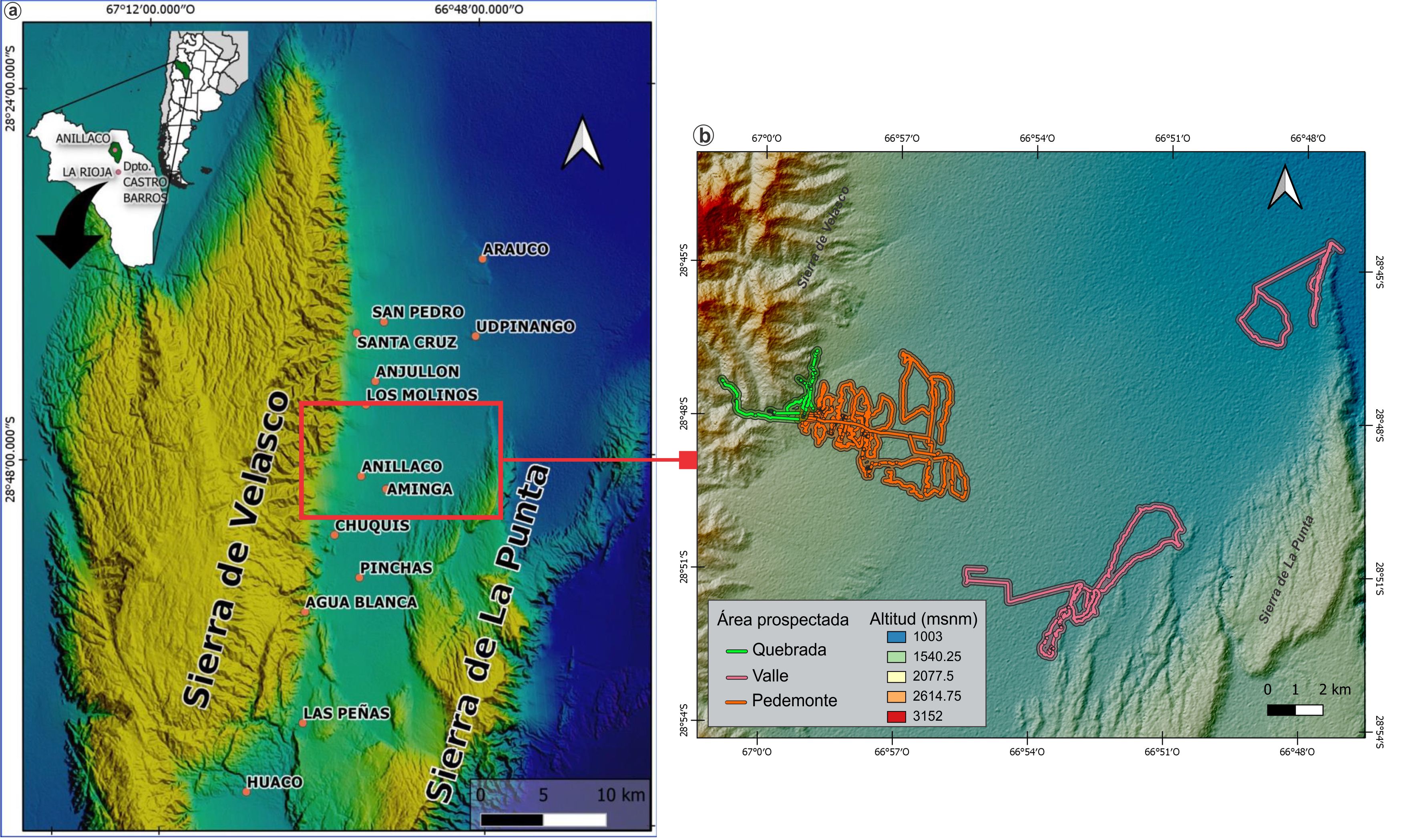 Nuestro trabajo se enmarca en la localidad de Anillaco y sus alrededores (28° 50′ S/ 66° 56′ O), en el departamento de Castro Barros, provincia de La Rioja. El marco geográfico abarca desde la sierra de Velasco hasta el valle de La Punta. La selección del área de estudio incorpora diversos ambientes y relieves contrastantes, desde la sierra (entre los 3000 hasta los 1600 msnm), con faldeos de pendiente pronunciada, laderas rocosas, las quebradas húmedas con ríos permanentes hasta el piedemonte o “costa” (entre los 1600 y los 1400 msnm) como zona de transición y la llanura o planicie final delimitada por la sierra de La Punta (Figura 1.a).