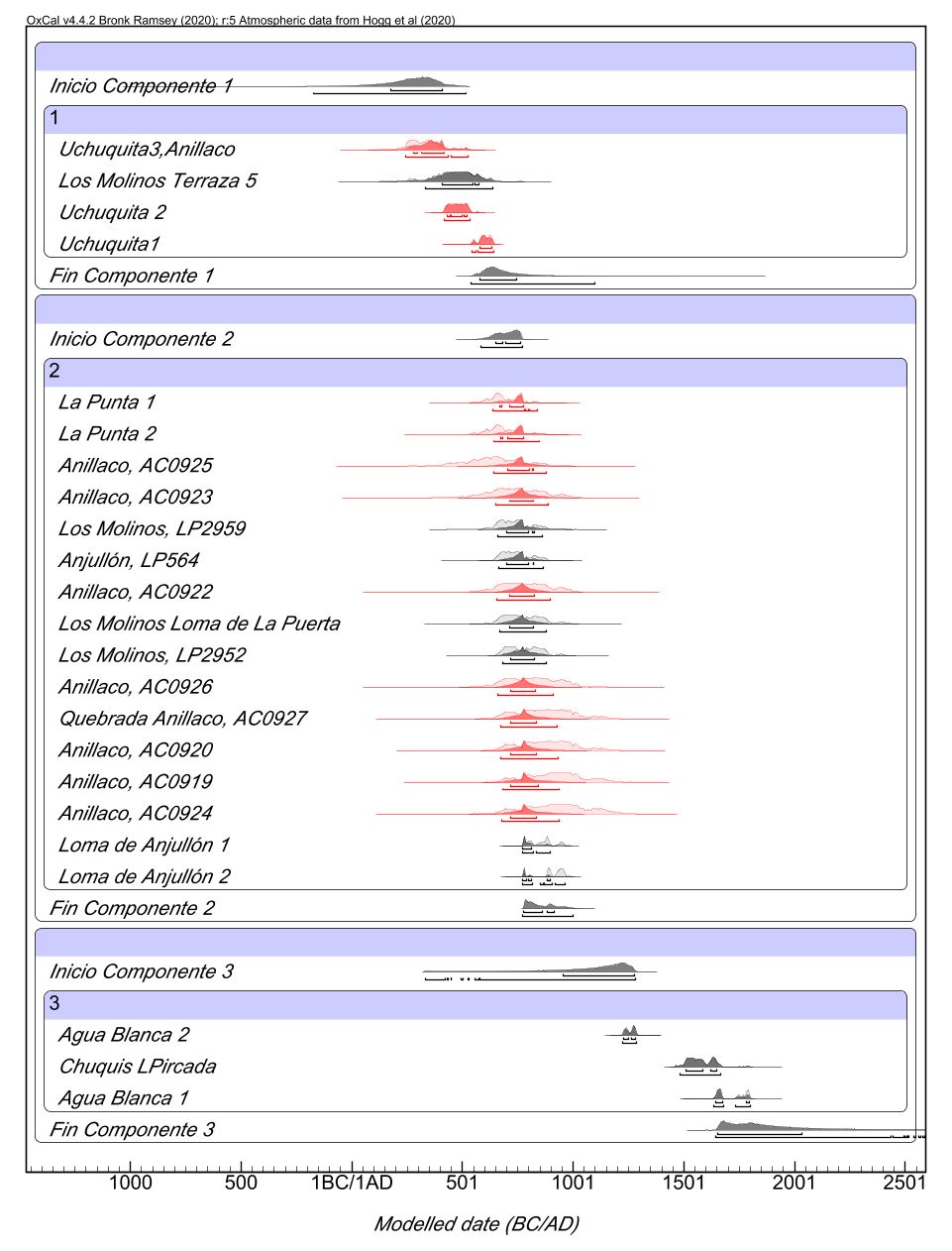 Utilizamos estadística bayesiana para evaluar la pertinencia de las inferencias e hipótesis temporales, ya que permite relacionar el conjunto de probabilidades de los datos con otros tipos de información arqueológica para poner límite a los intervalos (Bronk Ramsey, 2009). El uso del softwarede OxCal v4.4 permite aplicar esto mediante modelos basados en fases y secuencias. La inclusión de indicadores de consistencia estadística de los modelos utilizados (Aoverall y Amodel mayores a 60%) nos permite definir los límites iniciales y finales de la secuencia general y evaluar las hipótesis de intervalos para secuencias múltiples.