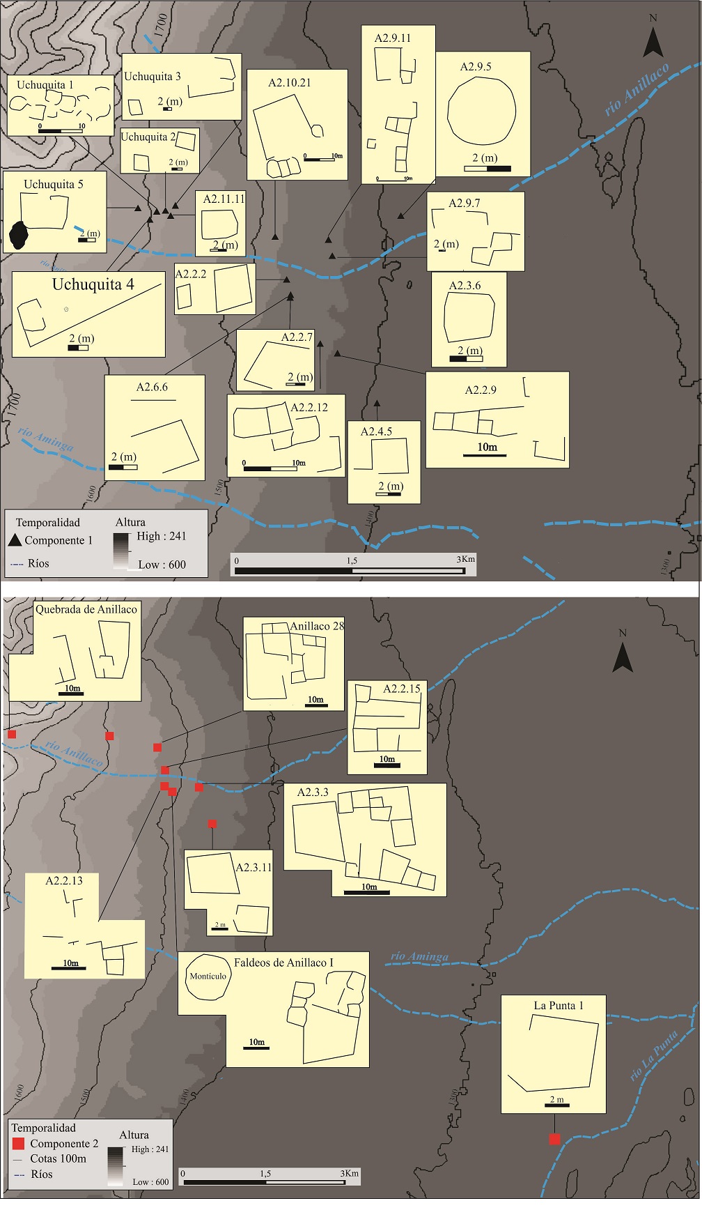 A partir de estos componentes temporales confeccionamos mapas vectoriales en donde configuramos las capas de paisajes aldeanos mediante la relación de las planimetrías de los sitios residenciales con la asignación temporal correspondiente. Para lograrlo, extendimos nuestra definición cronológica de los registros datados por radiocarbono a aquellos que por analogía con la identificación de componentes tecnológicos cerámicos presentaban conjuntos asimilables (Carosio et al., 2019). De esta manera, durante el componente 1 predominan las estructuras residenciales categorizadas como sitios simples (n = 13) por sobre las construcciones compuestas (n = 4). En cambio, para el segundo componente se presenta un modelo arquitectónico homogéneo de sitios residenciales (n = 8) categorizados como compuestos y complejos, como Anillaco 28, Faldeos de Anillaco y Quebrada de Anillaco, excepto el sitio La Punta 1, que se compone de una sola unidad residencial, que se encuentra asociada a otros espacios simples (Sabatini et al., 2021) (Figura 4).