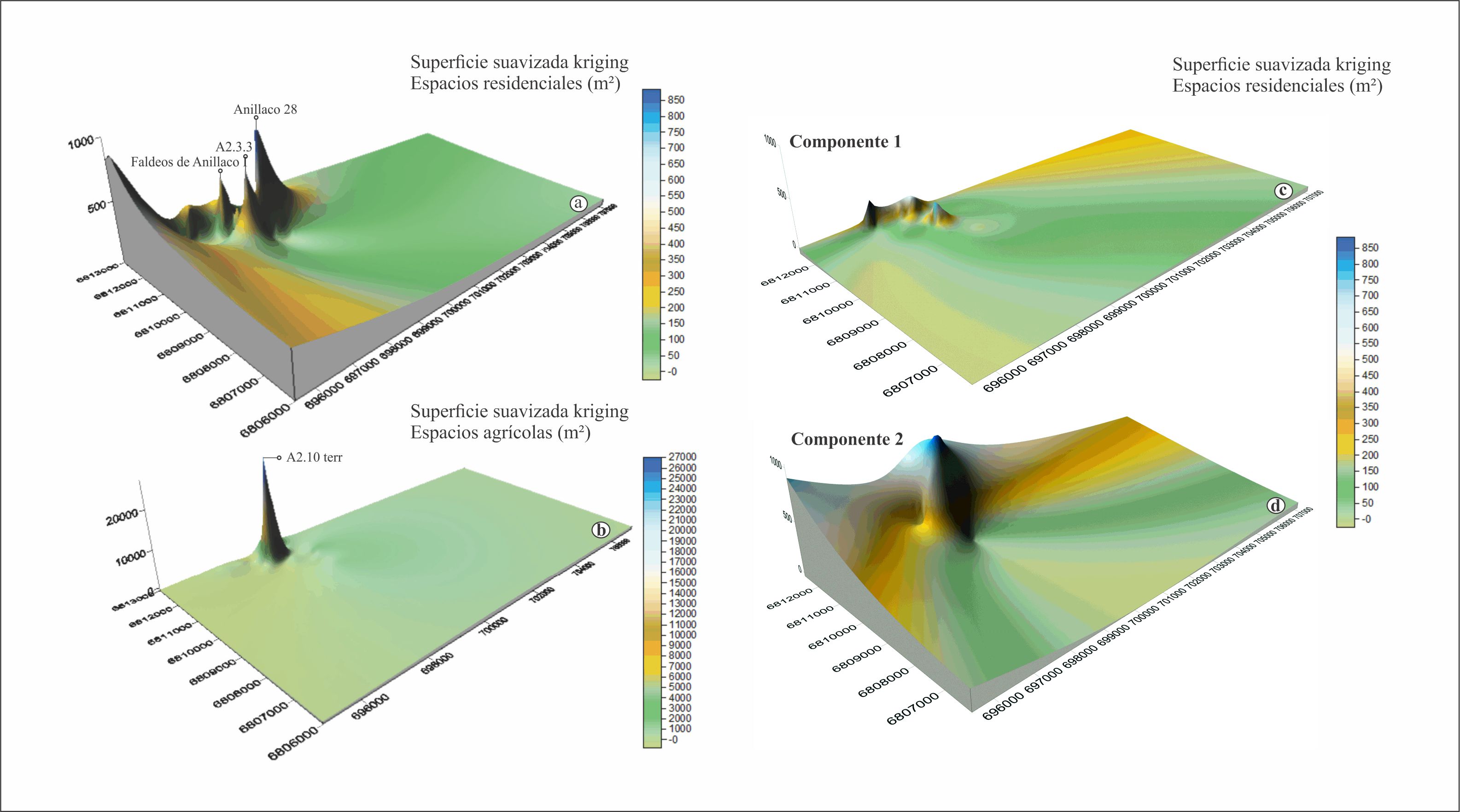 La interpolación kriging de toda la muestra sin diferenciación cronológica de espacios residenciales (Figura 5.a) resalta cuatro picos con base medianamente extendida, correspondientes a los sitios de mayores dimensiones registrados en el área, entre los que podemos nombrar a Anillaco 28, A2.3.3, Faldeos de Anillaco I y Quebrada de Anillaco. Asimismo, observamos picos de baja altura que reflejan unidades residenciales con superficies inferiores. Por su parte, el modelado de la superficie de los espacios agrícolas destaca un pico mayor con una pequeña área de influencia, que corresponde al sector agrícola denominado A2.10.Terr (Figura 5.b).