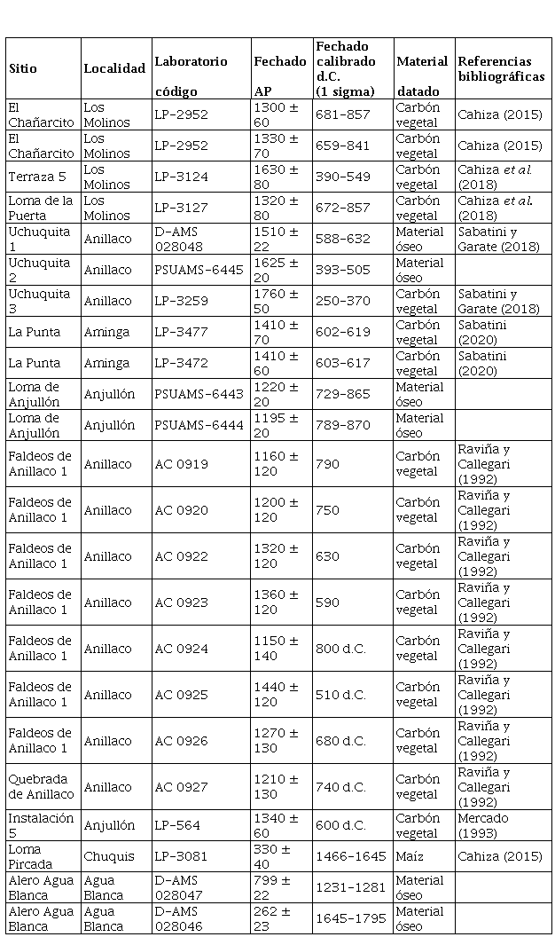 Durante los últimos años, generamos cinco fechados radiocarbónicos en Anillaco, tres de ellos realizados sobre muestras de carbón vegetal y dos sobre restos óseos faunísticos, que corresponden al conjunto residencial Uchuquita 1, 2 y 3, ubicado en el piedemonte de la sierra de Velasco, y a La Punta 1, localizado en el valle del río homónimo (Sabatini y Garate, 2018; Sabatini, 2020; Sabatini et al., 2021). Estos registros, junto con las dataciones de Anillaco 28, Quebrada de Anillaco y Faldeos de Anillaco I (Raviña y Callegari, 1992), constituyen la muestra Anillaco. Para la realización del análisis bayesiano utilizamos una muestra de 23 fechados radiocarbónicos de sitios del departamento de Castro Barros correspondientes a una escala regional en la que destacamos las 13 dataciones provenientes de Anillaco, nuestra escala microrregional de análisis en este trabajo (Tabla 1).
