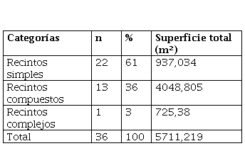 A partir de la categorización de los sitios residenciales en simples, compuestos y complejos (Cahiza, 2015), observamos la preponderancia de sitios simples (n = 23) pero que poseen menor superficie, mientras que las áreas superficiales se destacan en los espacios construidos compuestos (n = 10) y complejos (n = 1), ya que tienen plantas arquitectónicas con varios recintos habitacionales y espacios semipúblicos y públicos de mayores dimensiones. De esta manera, la categoría de sitios compuestos y sitios complejos tiene menos frecuencia que las locaciones simples y cuenta con una superficie mayor, que llega a quintuplicar a estas últimas (Tabla 2).