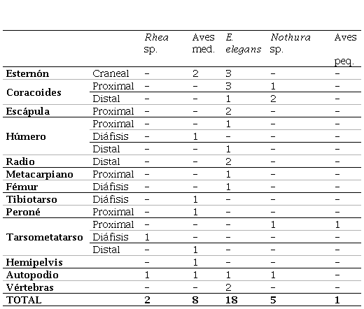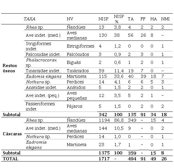 La muestra analizada incluye cáscaras de huevos (NISP = 1375, NMI = 8) y restos óseos (NISP = 342, NMI = 18). Entre los especímenes óseos predominan los de aves medianas (NISP% = 91,2), principalmente de tinámidos (Tabla 1), mientras que son escasos los restos de rheidos (3,8%) y aves pequeñas (5%). La especie más abundante es Eudromia elegans, tanto en especímenes (NISP% = 33,6) como en individuos (NMI = 7, obtenido en base a coracoides izquierdo). Otros restos de tinámidos corresponden a indeterminados (Tinamidae indet.) y a Nothura sp. Aunque los especímenes de otras aves de tamaño mediano son escasos, se determinaron elementos de estrigiformes (Strigiformes indet.), falcónidos (Falconidae indet.), y de dos grupos de aves acuáticas, patos (Anatidae) y biguás (Phalacrocorax sp.). Entre las cáscaras (Tabla 1) predominan especímenes de Rhea sp., con un peso de 251 g y correspondientes, al menos, a cuatro huevos. En menor cantidad se identificaron cáscaras de E. elegans, Nothura sp. y de aves medianas indeterminadas con distintas características: de color blanco crema con superficie rugosa (n = 14) y de color blanco con superficie lisa (n= 130), que a su vez presentan dos variantes: opacas y satinadas.
