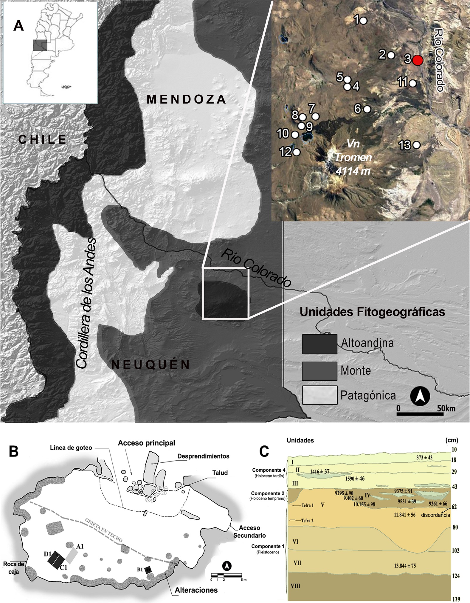 CH1 (36º57’S, 69º49’O, 1000 msnm; Figura 1A) se ubica en el extremo norte de la provincia del Neuquén, sobre la margen sur del río Colorado, en cercanías de su nacimiento. El sitio se emplaza en un área con extensa actividad volcánica en el retroarco Andino de la Payunia sur, concretamente, dentro del complejo del Tromen (e.g., Folguera et al., 2008). En pocas decenas de kilómetros en línea recta desde CH1, los rangos altitudinales oscilan desde 850 a 3900 msnm. Esta heterogeneidad topográfica determina que en distancias cortas se verifiquen cambios abruptos en las comunidades de micromamíferos (Fernández, 2012; Fernández et al., 2012; Bernardis, 2019; López et al., 2021). En este sector de Patagonia, comprendido entre los 30°–40°S, ocurre la transición de los sistemas de circulación atmosférica Subtropical y Templado, lo que se traduce en un clima árido y semiárido, con una variabilidad en la estacionalidad de las precipitaciones, que oscilan entre 200 y 300 mm anuales. La vegetación incluye un mosaico de comunidades fitogeográficas del desierto arbustivo del Monte y de la estepa arbustiva y herbácea Patagónica y Altoandina (e.g., Abraham et al., 2009).