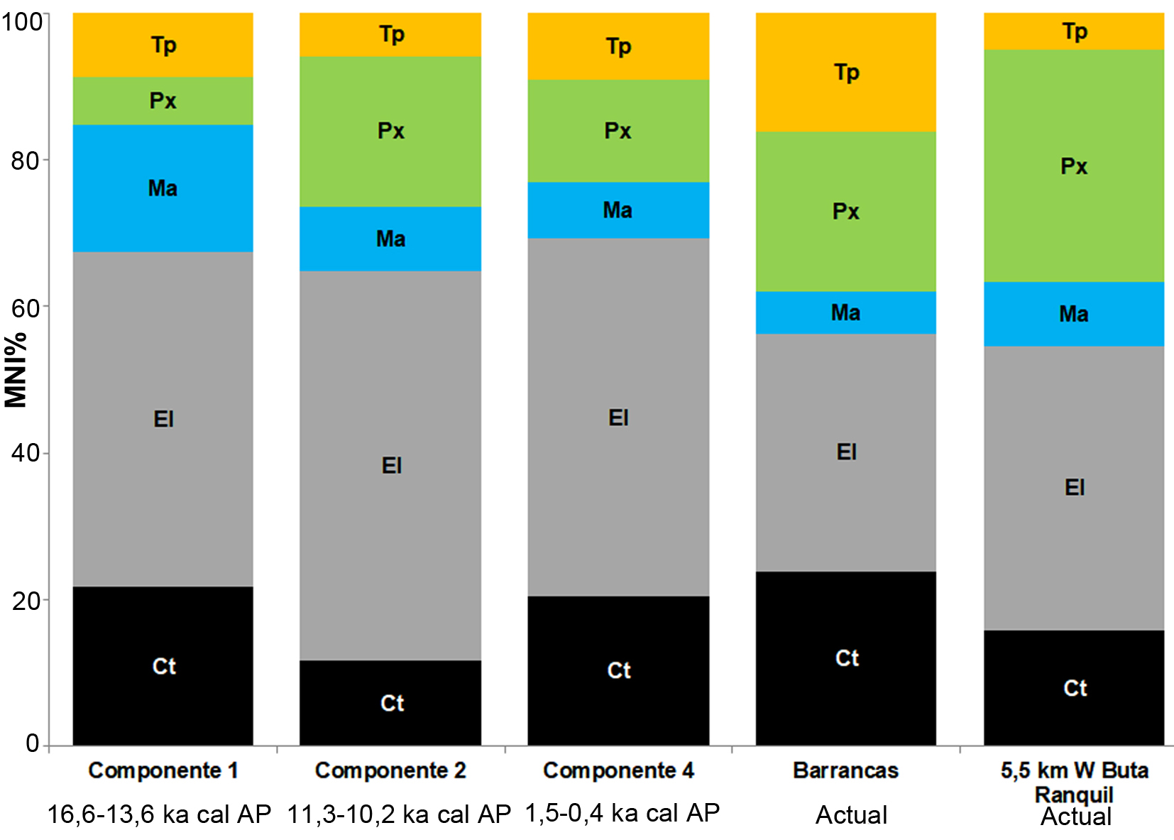 Por otra parte, la estabilidad ambiental indicada para los componentes estratigráficos de CH1 coincide con el registro polínico de Mallín Vaca Lauquen para el segmento temporal de 17,8-8,9 ka 14C AP (Markgraf et al., 2009) y con los datos proporcionados por los excrementos de Lagidium recuperados de las paleomadrigueras del sitio Cuchillo Curá (centro del Neuquén) hacia 16,4 ka cal. AP (Hofreiter et al., 2003). Diversos estudios paleoambientales provenientes de Chile central, sur de Mendoza y Neuquén señalan condiciones de estabilidad para el Holoceno tardío, con variaciones menores asociadas a El Niño Oscilación del Sur, semejantes a la actualidad (Markgraf, 1983; Jenny et al., 2002; Whitlock et al., 2006; Le Quesne et al., 2009; Markgraf et al., 2009; Zárate et al., 2010; Bianchi y Ariztegui, 2012; de Jong et al., 2013; Frugone-Álvarez et al., 2020).