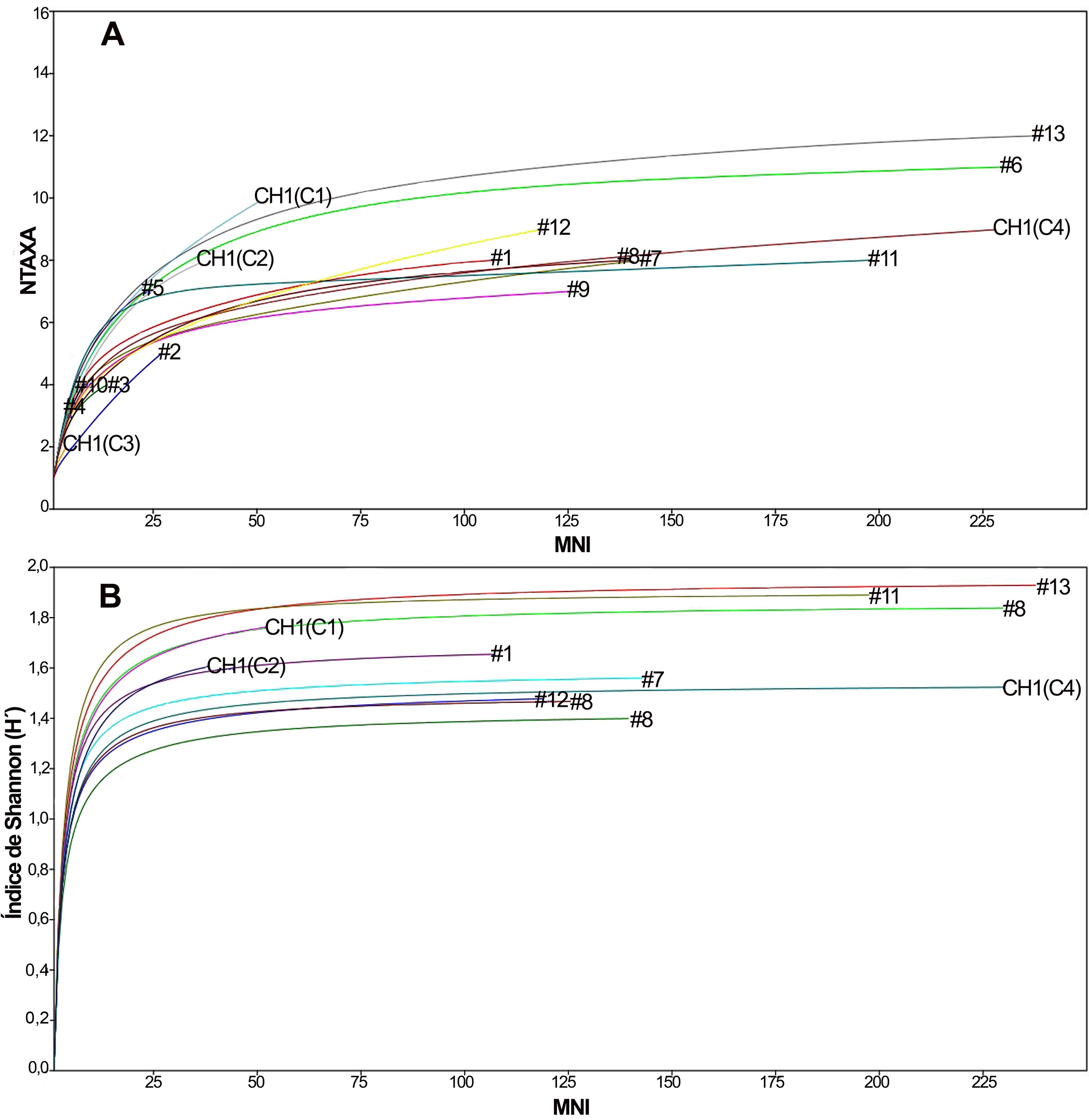 El análisis de rarificación realizado sobre los valores de riqueza y diversidad taxonómica (índice de Shannon) muestra que el conjunto arqueológico de micromamíferos del Componente 4 (1,5-0,4 ka cal. AP) es el único que alcanza una asíntota. De esta forma, constituye el componente estadísticamente más significativo, pero dificulta su comparación con los otros componentes arqueológicos (Figura 3). La mayor parte de las muestras de micromamíferos actuales de egagrópilas de .. furcata, con un MNI ˃ 50, tienen un comportamiento con tendencia asintótica y constituyen una herramienta confiable como parámetros actualistas, considerando la riqueza (Figura 3A) y la diversidad taxonómica (Figura 3B). En este sentido, la Figura 4A grafica los valores de riqueza y diversidad de los componentes arqueológicos y de las muestras actuales más robustas, y señala además escasas variaciones entre ellas y, principalmente, entre los componentes arqueológicos y las muestras actuales más cercanas al sitio (e.g., Barrancas).