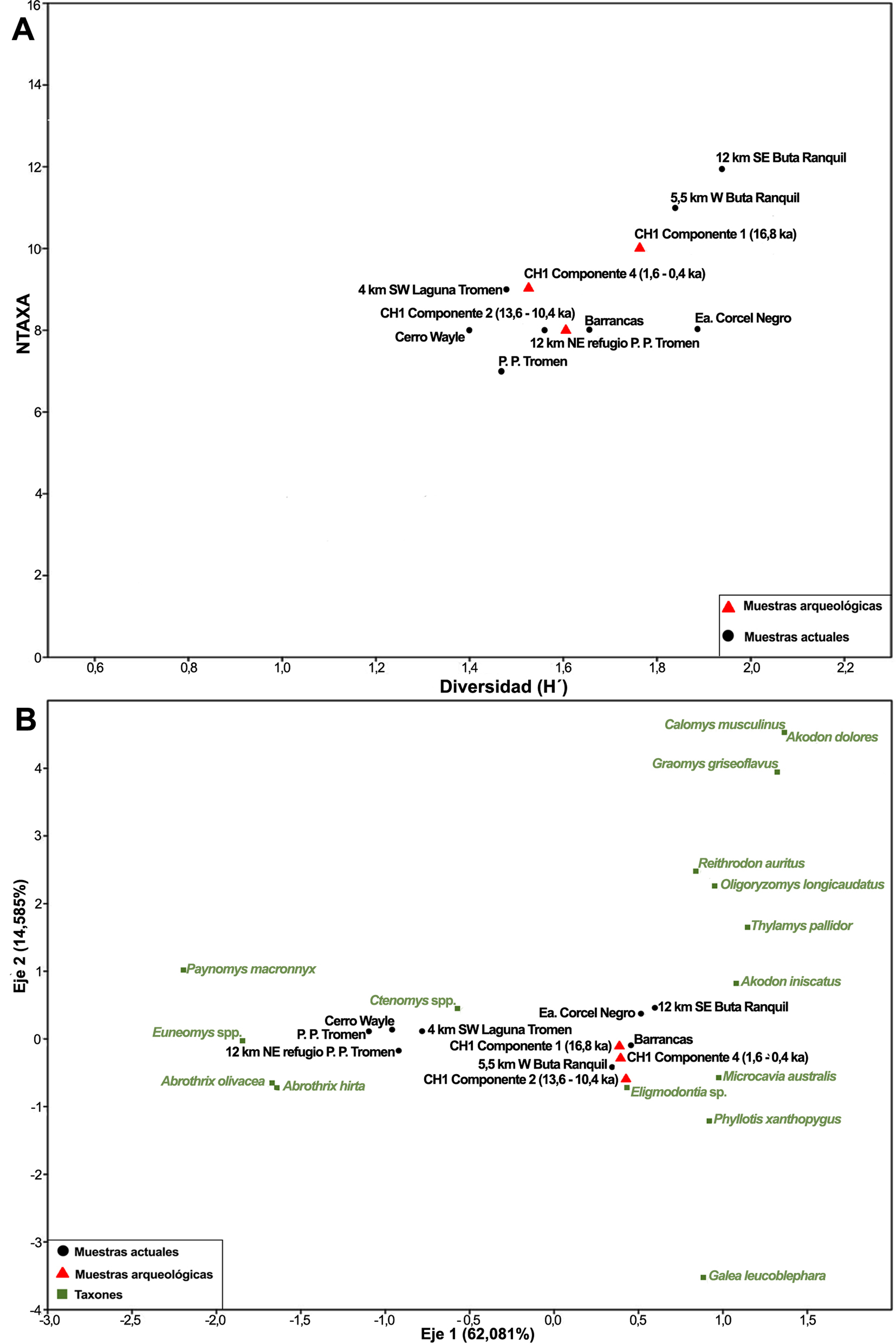En congruencia con los resultados reseñados, el análisis de correspondencias (Figura 4B) exhibe un agrupamiento de las muestras arqueológicas y las actuales más próximas al sitio, lo que sugiere una estabilidad de las comunidades de micromamíferos a lo largo del tiempo. El Eje 1 (62,1% de la varianza total) agrupa, hacia los valores negativos, a los taxones principalmente asociados a la estepa patagónica y, en la topografía local, a mayores niveles de altitud (Abrothrix spp., Euneomys spp., Paynomys macronyx); hacia los valores positivos se concentran las especies que habitan en el Monte y zonas de menor altitud (Akodon dolores, Calomys musculinus, Graomys griseoflavus, G. leucoblephara) o potencialmente comunes a ambos ambientes (A. iniscatus, Eligmodontia spp., M. australis, O. longicaudatus, P. xanthopygus,Reithrodon auritus, T. pallidior). El Eje 2 (14,6% de la varianza total) reúne hacia los valores positivos a los sigmodontinos típicos del Monte (A. dolores, C. musculinus, G.griseoflavus), ausentes en CH1 y registrados en algunas muestras actuales ubicadas en un rango altitudinal de entre 1000 y 1450 msnm (Figura 1A, Tablas 1 y 2). La posición central y levemente hacia los valores positivos de los componentes arqueológicos se relaciona con la abundancia de especies asociadas a ambientes arbustivos, abiertos y rocosos, que pueden habitar tanto en el Monte como en la estepa patagónica (Eligmodontia spp., M. australis, P. xanthopygus,T. pallidior). Esto resulta coherente con la virtualmente nula ocurrencia de elementos típicamente patagónicos en la historia de CH1 (escasa representación de A. olivacea y .. chinchilloides; ausencia de A. hirta y P. macronyx).