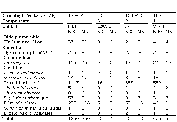 El aumento significativo en la muestra estudiada permite refinar algunos aspectos de la reconstrucción paleoambiental. En primer lugar, es necesario remarcar que la secuencia cronoestratigráfica de CH1 es discontinua y registra un segmento del Pleistoceno tardío-Holoceno temprano y otro del Holoceno tardío; la evidencia para el Holoceno medio es puntual, y al tratarse de una estructura sedimentaria antrópica, no representaría en forma significativa aportes no humanos. Por lo tanto, el planteo de estabilidad de las comunidades de micromamíferos que aquí se hace debe ser tomado con cautela. Al menos para las ventanas temporales indicadas, la estabilidad de los componentes faunísticos principales, tanto en presencia/ausencia como en abundancias relativas, resulta manifiesta.