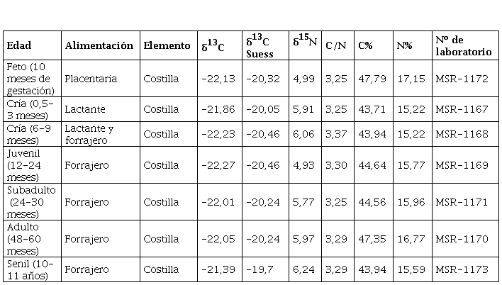 No obstante, los valores de δ13Ccol y δ15N para un feto y una cría (exclusivamente lactante) de guanaco presentados en este trabajo son similares a los de otros grupos de edad (incluida la madre), lo que sugiere que, aparte del rápido destete, otros factores condicionarían un patrón isotópico uniforme durante el crecimiento de los individuos de esta especie. Para el caso del feto, la información obtenida señala que la fuente de carbono y nitrógeno de la que se alimenta no sufre procesos metabólicos que cambien los valores del fraccionamiento inicial producido por la madre. Por su parte, el neonato exclusivamente lactante muestra la señal isotópica intraútero, ya que es muy joven (< 2 meses de edad) para fijar la información de la composición de la leche. En conjunto, la información disponible para guanacos de Patagonia austral y nororiental sobre los valores δ13Ccol y δ15N de diferentes clases de edad sugiere que el factor ontogénico no incidiría en la variabilidad isotópica de la especie. Es necesario resaltar que el patrón registrado hasta el momento debe ser robustecido estadísticamente, incrementando la muestra analizada de Cinco Chañares e incorporando al estudio muestras de otros ambientes.
