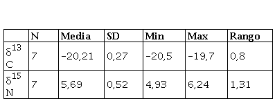 Las muestras modernas fueron analizadas en el Laboratorio de Isótopos Estables en Ciencias Ambientales (LIECA-IANIGLA-CONICET; UTN FRSR). El procedimiento para la extracción de colágeno se realizó según el método de Longin (1971) modificado, que es descripto a continuación. Cada muestra de hueso de aproximadamente 1 g fue descalcificada con HCl 0,6 M a 4 °C. Posteriormente se lavó con NaOH 0,1 M para la eliminación de contaminantes solubles en álcali y se realizaron tres lavados en agua tridestilada para la eliminación de sales. La gelatinización se realizó en HCl 0,06 M a 85 °C durante 24 horas. Finalmente, el colágeno disuelto se filtró (fibra de vidrio, 0,45 μm). El colágeno seco se obtuvo mediante liofilización: la solución de colágeno se congeló mediante inmersión en nitrógeno líquido y luego fue secada en una cámara al vacío, hasta obtener un peso constante de la muestra. Se registró el rendimiento de colágeno extraído respecto de la masa inicial de hueso procesada (% colágeno) y se midieron sobre los colágenos extraídos otros parámetros de calidad característicos, tales como la relación atómica C/N, %C y %N. Se utilizaron las relaciones C/N para evaluar la conservación del colágeno de las muestras (De Niro, 1985). Para el análisis de isótopos estables de C y N se utilizó un analizador elemental Flash 2000 acoplado a un IRMS Thermo Delta Advantage; los valores de δ13C y δ15N se informan en VPDB y aire respectivamente, en partes por mil. Como patrones internos de referencia para el control de calidad de las mediciones se utilizaron Col Polar (δ13C = -13,66; δ15N = 21,52), Col LIECA (δ13C = -18,16; δ15N = 11,07) y Cafeína LIECA (δ13C = -33,02; δ15N = -2,02). La incertidumbre en las mediciones fue de d 13C/12C = 0,07 y d 15N/14N = 0,06. Se aplicó un factor de corrección a las muestras modernas con el fin de compensar el llamado "efecto Suess", que produce una disminución en los valores de δ13C atmosférico (Long et al., 2005).