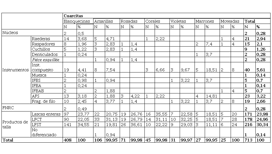 La determinación de las cuarcitas se realizó de manera macroscópica. A su vez, todas las piezas fueron agrupadas según sus colores a partir de la carta de suelo realizada por Munsell (1994) (e.g.,Colombo y Flegenheimer, 2013). Las piezas se dividieron en las siguientes categorías artefactuales: núcleos, instrumentos, filos naturales con rastros complementarios (FNCR) y productos de talla (Tabla 1).