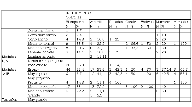 En líneas generales, observamos los mismos objetivos de producción sobre los diferentes colores de cuarcita identificados. En relación con las técnicas de talla utilizadas para la confección de soportes de los instrumentos analizados, predomina la talla unipolar en todos los conjuntos, mientras que la bipolar solo se observa entre las cuarcitas blanquecinas, amarillas y rosadas. En ambos casos, el objetivo de producción mayoritario fue la búsqueda de soportes con módulo laminar.