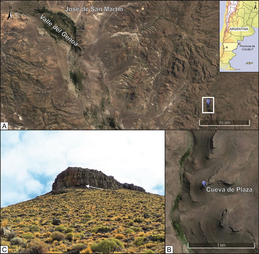 La Cueva de Plaza (CDP, en adelante) se encuentra en un cañadón ubicado en la cuenca superior de un afluente del río Genoa, a unos 32 km lineales al sudeste de la localidad de José de San Martín (Chubut) (Figura 1A), en la Patagonia extraandina. Esta región se caracteriza por presentar condiciones de semidesierto con estepas arbustivas graminosas (León et al., 1998), clima frío, ventoso y seco (precipitación media anual de 200 mm, concentrada en el invierno y con un marcado déficit hídrico en el verano). La cueva tiene dimensiones pequeñas (9 m de profundidad, 2 m de ancho y una altura que oscila entre 1,50 m y 1,20 m) (Figura 2) y fue localizada por Horacio Plaza, quien identificó la presencia de huesos humanos dispersos en superficie dentro de la cueva, en el talud adyacente y en un pequeño nicho rocoso próximo a la entrada. Con el fin de evitar su destrucción, los relocalizó en una pequeña oquedad ubicada en la pared este de la cueva (Figura 2 A). Durante el trabajo de campo de 2019, el Sr. Plaza nos informó de la existencia de este sitio y de su estado. Si bien no estaba planificado, nos propusimos realizar un trabajo de rescate de unos pocos días, ante el peligro que corría la integridad del conjunto. En la superficie del interior de la cueva se observó una capa de guano compacta de aproximadamente 10 cm de espesor (capa 1 en Figura 2 y 3). Desde la entrada de la cueva y hasta unos 5 m hacia el interior, esta capa estaba ausente. Si bien consideramos que esta remoción estaría relacionada con el pisoteo de animales, no podemos descartar una alteración intencional humana (saqueo).