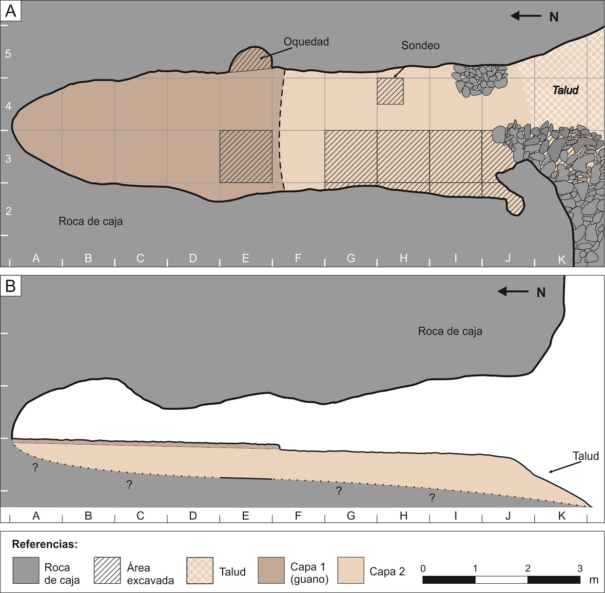 Como se trataba de un trabajo de rescate, se recolectó todo el material disperso en superficie y se dividió el sitio en cuatro sectores: interior de la cueva, talud de la entrada, oquedad (en la pared este) y nicho (adyacente a la cueva). Este último, de 2 m de ancho × 2,2 m de largo, se ubica a unos 10 m hacia al este de la entrada de la cueva y contenía unos pocos restos óseos humanos (NISP = 15) y faunísticos (NISP = 14). El análisis tafonómico de estos restos no justificó su separación del resto, por lo que se los trató como parte del mismo conjunto. Salvo la concentración de huesos humanos en la oquedad, producto de la mencionada recolección del Sr. Plaza, no se detectaron otras concentraciones de materiales. Para comprobar si había materiales enterrados y estudiar la estratigrafía, se practicó un sondeo en un sector donde la capa de guano (capa 1) estaba ausente y se excavó una cuadrícula, de 1 × 1 m, donde esta capa estaba conservada (E3, Figura 2 A). En E3 pudimos definir, en la base de la capa 1, una lente de color negro. Por debajo, se identificó un sedimento eólico fino mezclado con cascajo desprendido de la roca de caja que fue denominado capa 2 (Figura 2 B). Se tomaron muestras de estos sedimentos que aún deben ser analizadas. En esa cuadrícula se recuperaron una lasca en la capa 1 y dos huesos humanos pequeños en la lente negra, lo que nos llevó a pensar que parte de los restos óseos humanos pudieron haber sido depositados por debajo o de manera penecontemporánea a la conformación de esta capa de guano. En la capa 2, por debajo del nivel de guano, se recuperaron solamente huesos de animales. A casi 70 cm de profundidad, con una humedad creciente de los sedimentos, encontramos la roca de base. En el sector interior, cerca de la entrada, se localizaron una serie de rocas acumuladas (Figura 2), por lo que allí, para verificar la presencia de materiales enterrados, se excavaron otras siete cuadrículas de 1 × 1 m (G2, G3, H2, H3, I2, I3 y J3, Figura 2 A) hasta la roca de base (entre 40 y 70 cm de profundidad). Los sedimentos fueron tamizados con zarandas de malla de 2 mm.