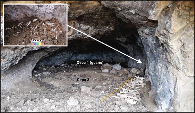 La datación realizada sobre una primera falange proximal de la mano de un adulto arrojó una edad de 225 ± 33 años AP –AA113831; hueso; C/N: 3,3; δ13C (± 0,1‰, 1σ): -19,1; δ15N (± 0,15‰): 11,6–, con un rango que comprende desde los 305 años cal. AP al presente (OxCal 4.2/SHCal20). Una segunda datación sobre un segundo metacarpiano de un subadulto indicó una edad de 179 ± 48 años AP (AA113832), pero la proporción atómica C/N registró un valor inusual (2,5), por lo que el laboratorio recomendó su reprocesado. Igualmente, podemos considerar que por lo menos dos de los individuos presentes en la cueva fueron depositados entre los siglos XVIII y XIX.