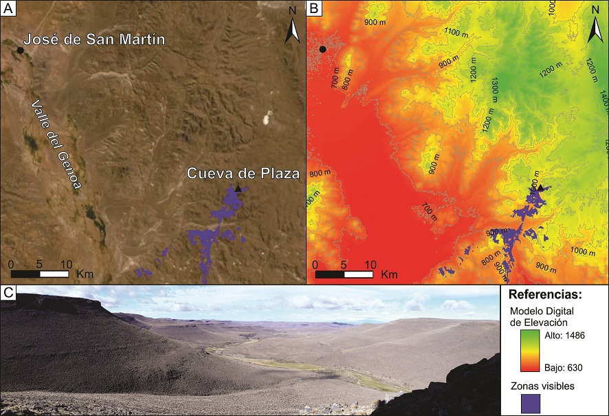 Cuando iniciamos nuestro proyecto de investigación en el valle del Genoa (centro-oeste de la provincia de Chubut, Figura 1), teníamos muy poca información arqueológica previa. Por un lado, se contaba con las investigaciones de Carlos Gradin en el cerro Shequen, en el sur de este valle (Gradin, 1978). Por otro lado, nuestros trabajos más recientes se llevaron a cabo en el vecino valle del río Pico (Scheinsohn et al., 2011, 2016, 2020; Rizzo et al., 2016; Rizzo, 2017). Finalmente, al iniciar las investigaciones en los alrededores de la localidad de José de San Martín, supimos de la existencia de un sitio con arte rupestre en el establecimiento Tres Lagunas (M. M. Novella, comunicación personal, 2009). Todas estas evidencias permitían suponer que este valle había sido ocupado durante el Holoceno tardío. Sin embargo, al poco tiempo pudimos estudiar y datar en 4700 años AP un conjunto de restos óseos humanos que habían sido recuperados en el establecimiento Fabiana Elizabeth, cerca de José de San Martín (Scheinsohn et al., 2017). Sobre esta base, a la cual sumamos diversos sitios de superficie (Leonardt et al., 2016; Rizzo et al., 2016), pudimos argumentar para el valle del Genoa la existencia de, al menos, un pulso ocupacional correspondiente al Holoceno medio y una ocupación continua a partir del Holoceno tardío. En este contexto, la Cueva de Plaza (Figura 1) es el primer sitio del área que permite dar cuenta del momento en que las poblaciones indígenas del Genoa debieron enfrentar la ocupación europea/criolla. Este sitio, además, nos permitió comenzar a discutir las prácticas funerarias correspondientes a este lapso. En este trabajo se presenta un primer acercamiento a él, para el cual combinamos la información geomorfológica, bioarqueológica y paleopatológica de los restos óseos y dentales humanos y la obtenida a partir de otros materiales arqueológicos (líticos, vítreos y faunísticos) recuperados allí. En futuros trabajos plantearemos análisis más específicos.