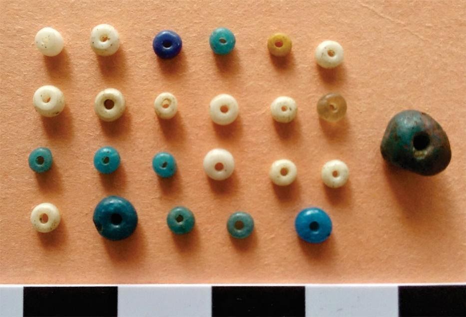Si bien el conjunto exhibe un buen estado de preservación, todas las piezas presentan pequeños hoyuelos (pocos y dispersos), que pueden ser producto tanto de su uso en collares o pulseras como del contacto directo con el sedimento en el que permanecieron depositadas (Bonneau et al., 2014). En cuanto a las alteraciones químicas, 11 cuentas presentan apariencia levemente empañada, correspondiente con una fase inicial de degradación del vidrio (López, 2011). Solo en la cuenta de morfología irregular se observó la presencia de sectores con iridiscencia, coincidente con un estado más avanzado de degradación, posiblemente vinculado con la acción de la humedad (López, 2011). Por su diseño y técnica de manufactura, estas cuentas encajan dentro del tipo veneciano, comunes en el registro arqueológico de Pampa y Patagonia de los siglos XVI al XIX (Tapia y Pineau, 2013 y citas allí presentes).