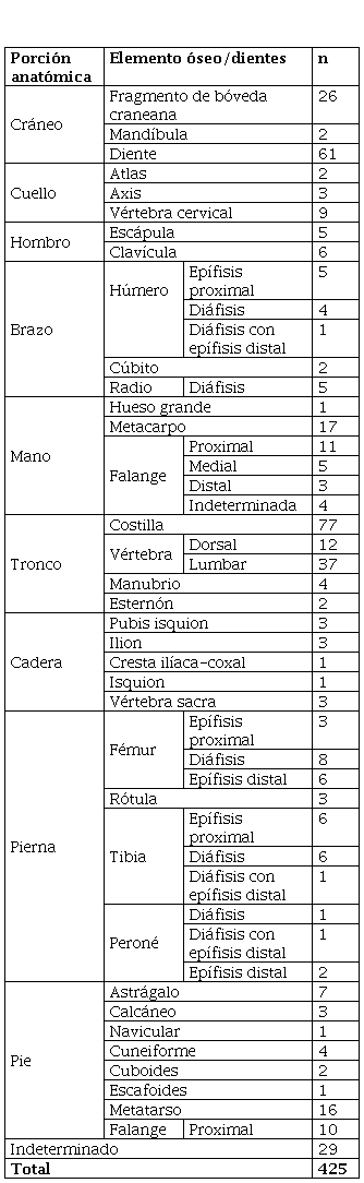 No se recuperaron cráneos completos, solo fragmentos de al menos dos bóvedas craneanas, una mandíbula completa con siete dientes en alvéolo (a la que se le dio un tratamiento diferencial, separada de la muestra de dientes sueltos, para poder incluir el análisis de otras variables y asociar estos dientes a un individuo en particular, lo que no pudo hacerse en el caso de los dientes sueltos), un fragmento de mandíbula y un fragmento de maxilar con un tercer molar en formación. En cuanto a las piezas dentales sueltas, predominan los dientes permanentes (n = 55; 90%) y posteriores (n = 36; 59%), con mayoría de molares (n = 20; 32%).
