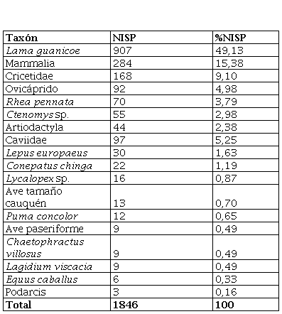 La mayoría de los restos faunísticos estaban dispersos en el interior de la cueva y en el talud pero no se detectaron concentraciones. El 60% de los 4596 restos óseos y dentarios analizados no pudieron ser identificados taxonómicamente. Entre los identificados (NISP = 1846), predomina el guanaco (Lama guanicoe), seguido en importancia por Mammalia, roedores cricétidos y ovicápridos, que integran los restos asignados a oveja (Ovis aries) y cabra (Capra hircus). Siguen en importancia el choique (Rhea pennata), tuco-tuco (Ctenomys sp.) y Artiodactyla. Además, se pudieron identificar liebre (Lepus europaeus), zorrino (Conepatus chinga), aves paseriformes y del tamaño del cauquén común (Chloephaga picta), zorro (Lycalopex sp.), puma (Puma concolor), caballo (Equus caballus), peludo (Chaetophractus villosus) y lagartijas (Tabla 2).