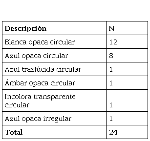 Se recuperaron 24 cuentas de vidrio: 20 proceden de las cuadrículas H2, I2, I3; tres del pircado en la entrada de la cueva (cuadrículas J3 y K3) y una del talud (Figura 2 A). Todas están completas, son monocromas, de estructura simple (compuestas por solo una capa de vidrio), no poseen decoración y fueron fabricadas mediante técnica de globo de vidrio estirado (Figura 5). En función de su morfología, diafanidad y color, pueden clasificarse en seis variedades, que se detallan en la Tabla 3.