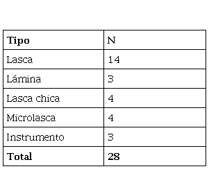 Se recuperaron 28 artefactos líticos, en su mayoría desechos de talla, dentro de la cueva, en el talud adyacente y en la ladera de acceso al sitio (Tabla 4). Tres son instrumentos: un cuchillo unifacial (recuperado en la ladera), una preforma bifacial (localizada en el talud inmediato a la cueva) y una raedera (recuperada en el interior de la cueva). La preforma y la raedera están confeccionadas en calcedonia, y el cuchillo, en toba.