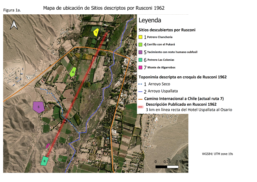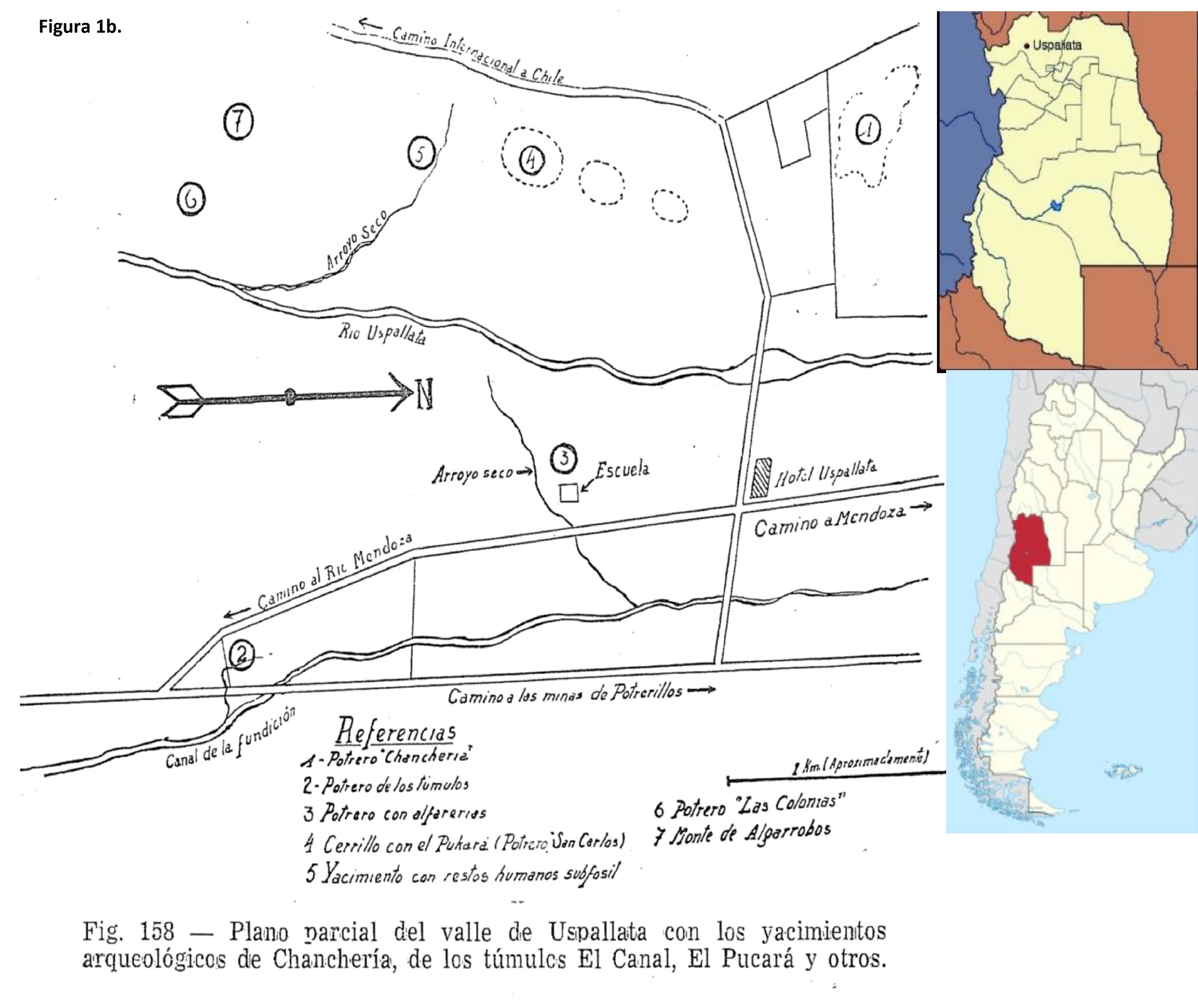 OPLC se encuentra inmediatamente al oeste de la villa de Uspallata (32°36’ S, 69°21’ O), en el noroeste de la provincia de Mendoza (Figura 1 a y b). Como parte de las tareas de reevaluación del sitio, en noviembre de 2018 se recorrió la localidad en forma exhaustiva y se localizó el probable lugar de su emplazamiento sobre la base de la comparación con el registro fotográfico existente y su descripción detallada junto con un croquis de su ubicación (Rusconi, 1962a, p. 195). Lamentablemente, en la actualidad el área presenta una alteración profunda vinculada a la actividad agrícola y residencial que allí se desarrolla y no se observó potencial de preservación contextual del sitio.