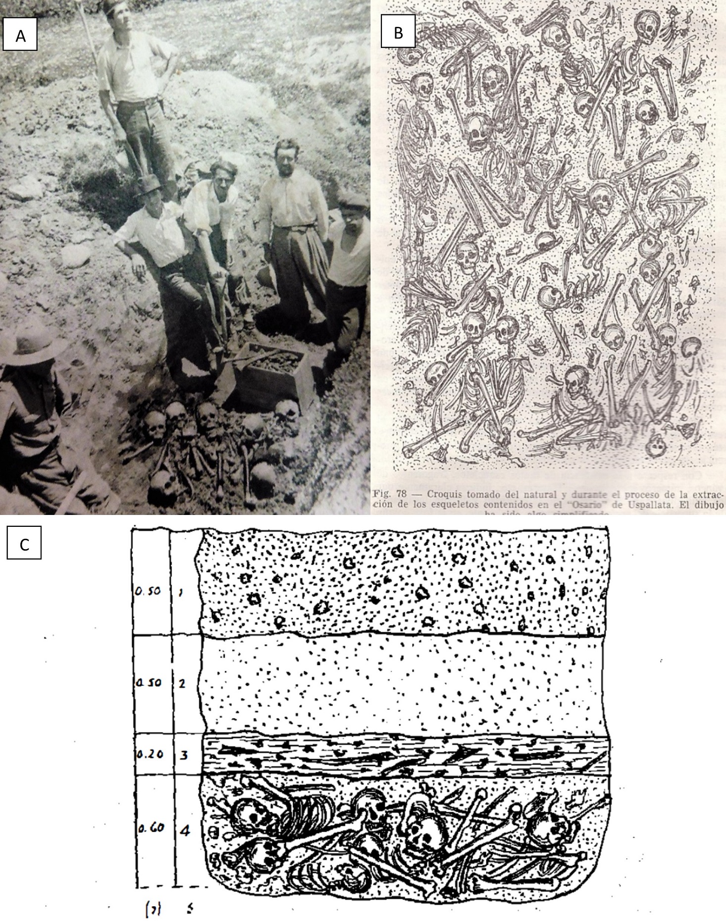 El sitio fue excavado con técnicas y registro acordes con la época (1939), lo que generó un corpus de información detallada de las tareas de campo, aunque limitada en comparación con estándares actuales de excavación. Asimismo, las condiciones de preservación no fueron controladas ni estandarizadas, por lo que afectaron la integridad de los conjuntos. Los restos recuperados fueron depositados en cajas separadas por partes esqueléticas, lo que implicó una descontextualización de los elementos anatómicos entre sí. De este modo, se configura un registro promediado en la escala del conjunto y con baja resolución anatómica, lo cual requiere estrategias particulares para el análisis bioarqueológico (Ruipérez, 1989-1990; Buikstra, 2006; Luna, 2008).