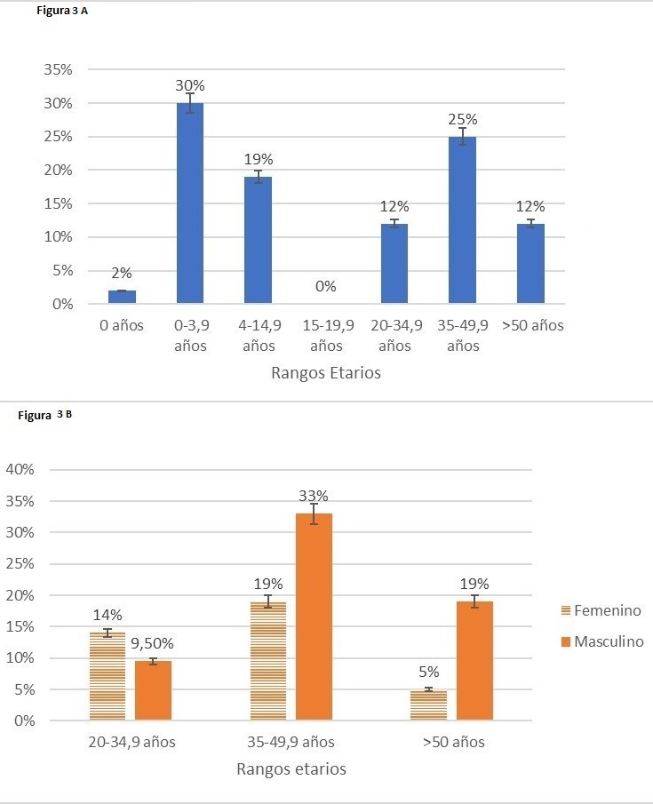 Los resultados obtenidos en la estimación de edad para el grupo de subadultos corresponden a un 41% de la muestra, ya que pudieron aplicarse estos análisis en 22 de 54 individuos estimados por MNI. En el caso de los individuos adultos, la estimación se realizó en la totalidad de los cráneos presentes (N = 21), lo que corresponde a un 30% del total estimado (MNI = 70). Teniendo en cuenta el N total para la estimación de edades (N = 43), la muestra quedó conformada por las siguientes categorías etarias: un fetal (2%), 13 infantes (30%), ocho niños (19%), ningún adolescente (0%), cinco AJ (12%), 11 A (25%) y cinco AM (12%) (Figura 3A). Con respecto a la determinación del sexo, según los análisis del cráneo, la muestra se divide en ocho femeninos (38%) y 13 masculinos (62%), que se distribuyen de la siguiente manera: en AJ, 14% individuos femeninos y 9,50% masculinos; en A, 19% son individuos femeninos y 33% masculinos; y en AM, el 5% son individuos femeninos y el 19%, masculinos (Figura 3B).