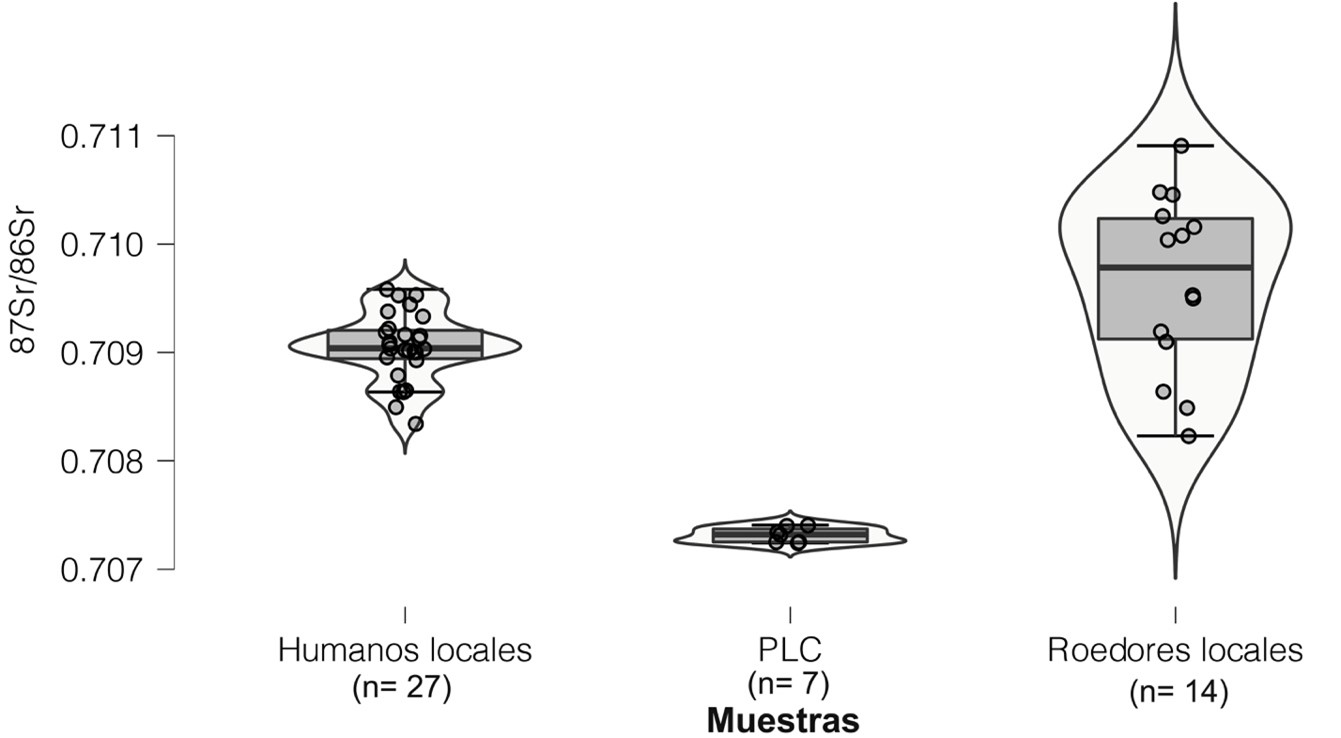 Las siete muestras analizadas a nivel de 87Sr/86Sr representan un 6% del MNI reconstruido, por lo cual se puede considerar que, en esta instancia, ofrecen información exploratoria. Sin embargo, es clave enfatizar que estas muestras fueron seleccionadas en forma aleatoria. En este contexto, resulta llamativo que las siete muestras tengan valores muy similares entre sí, con un promedio de 0,70731, ubicadas en un acotado rango que va entre 0,70724 y 0,7074. En forma inesperada, el conjunto de muestras de OPLC no presenta ninguna superposición con un conjunto de 14 muestras de roedores procedentes de Uspallata y Precordillera que son empleados para construir la base de estroncio biodisponible a nivel local (Barberena et al., 2020, 2021). Asimismo, estas muestras se diferencian estadísticamente de un conjunto de 27 muestras humanas procedentes de otros sitios en el valle de Uspallata (Túmulo I, Túmulo II, Túmulo III, Barrio Ramos I), cuyos valores se ubican entre 0,7083-0,7095 (Barberena et al., 2020), las cuales son interpretadas como de residencia local al valle de Uspallata en un período que se extiende en forma discontinua entre 700 y 1500 DC (Figura 4). Esto permite reconstruir que, aunque fueron enterrados en el valle de Uspallata, los siete individuos muestreados no residieron en esta región geológica durante los últimos años de su vida, por lo que se infiere que se trata de migrantes de primera generación.