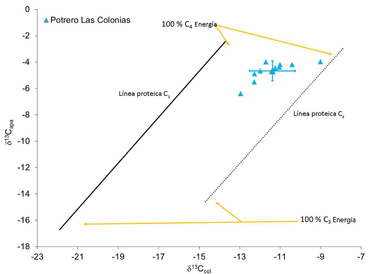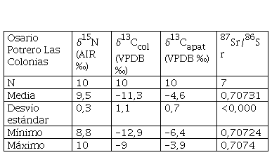 A nivel de isótopos estables, se observa una baja variabilidad en los resultados obtenidos para las tres relaciones isotópicas. En el δ13Ccol, el valor medio fue de -11,3‰, con un rango entre -12,9‰ y -9‰; mientras que en el δ15N, la media fue de 9,5‰ y el rango se da entre 8,8‰ y 10‰. Respecto de la apatita, el δ13Cap promedio fue de -4,6‰, con valores ubicados entre -6,4‰ y -3,9‰. El rasgo más saliente de estos resultados es que los individuos recuperados en OPLC consumieron principalmente recursos pertenecientes a cadenas tróficas C4.