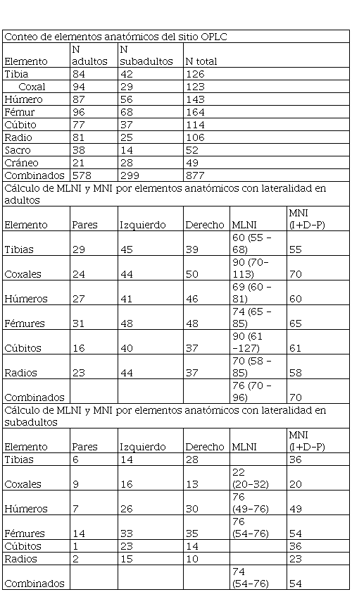 Se contabilizaron los restos óseos y se separaron en especímenes (fragmento o hueso entero que corresponde a un determinado elemento o porción anatómica del esqueleto) de individuos adultos y subadultos para ser inventariados. Luego se estimaron el Número Mínimo de Individuos (MNI), equivalente al número de individuos necesarios para dar cuenta de los restos óseos identificados para cada elemento anatómico (Grayson, 1984; Lyman, 1994), y el Número más Probable de Individuos (MLNI). Esta alternativa al MNI proporciona más poder analítico cuando se trata de restos mezclados, ya que estima el número original de individuos representados por el conjunto osteológico, mientras que el MNI solo estima el conjunto recuperado (Adams y Konigsberg, 2004).