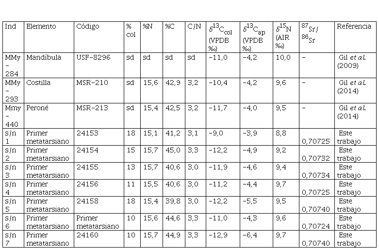 En la Tabla 2 se presentan los resultados isotópicos para OPLC obtenidos en este trabajo, junto con la información paleodietaria ya publicada para otros tres individuos (Gil et al., 2009, 2014). Se incluyen los indicadores de preservación y contaminación de las muestras. Todos los parámetros analizados reflejan que las muestras estudiadas se encuentran en buenas condiciones y que, por lo tanto, los valores isotópicos obtenidos son primarios (van der Merwe, 1982; Ambrose, 1993). En la Tabla 3 se presenta la estadística descriptiva de los resultados isotópicos para las muestras de OPLC.
