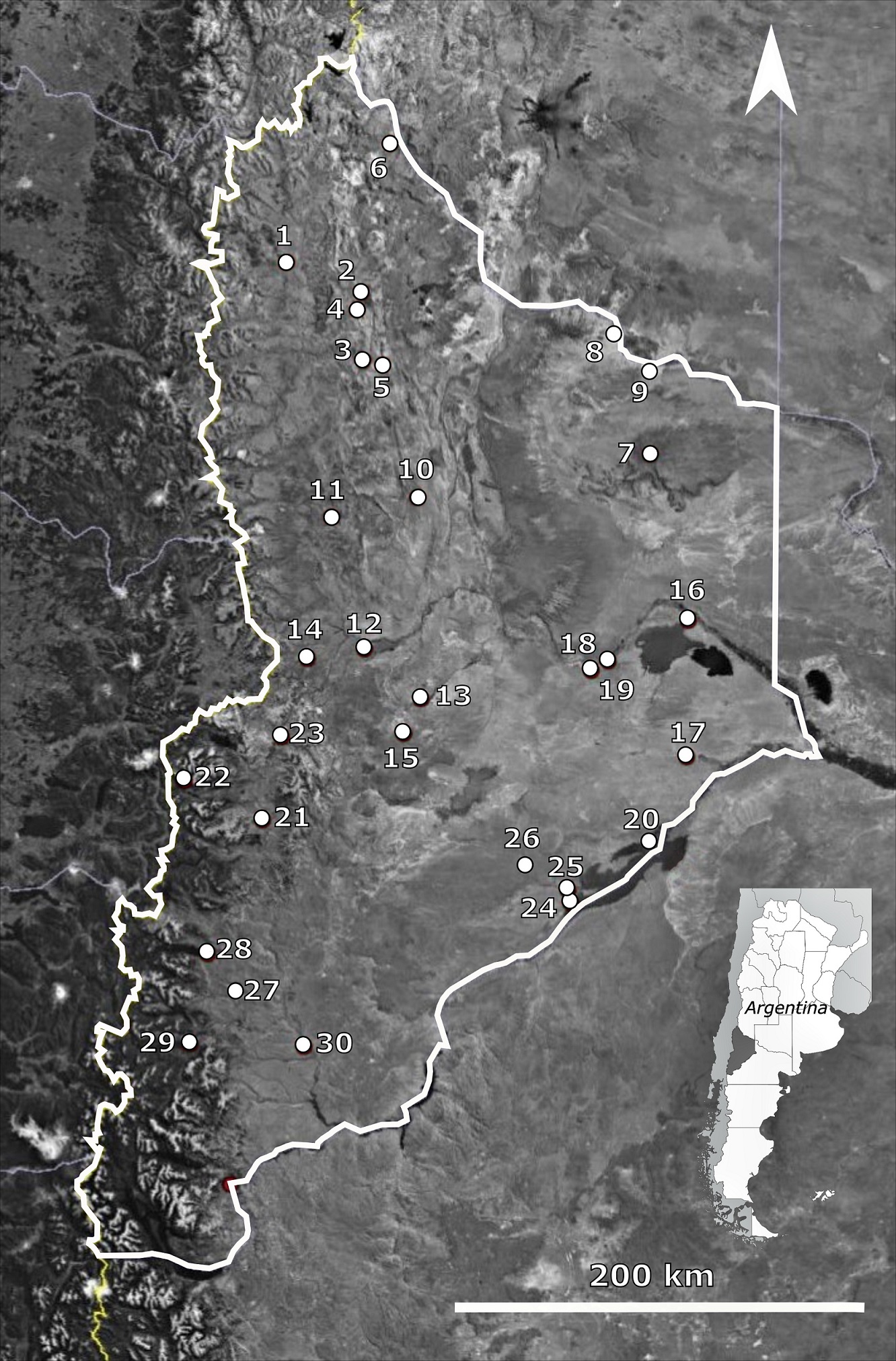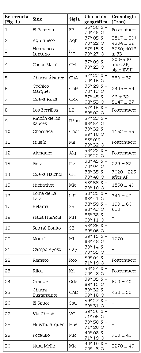 La muestra de estudio está conformada por restos óseos humanos de 30 sitios arqueológicos (Figura 1), cuya distribución incluye diferentes contextos geoambientales y cronológicos (7000 hasta 200 años AP; Tabla 1). Se trata mayoritariamente de sitios a cielo abierto, con entierros primarios y sin estructuras funerarias asociadas, a excepción de dos sitios en cuevas (Cueva Ruka y Cueva Haichol) y dos en aleros (Moro I y Chorriaca), dos sitios con entierros secundarios (Aquihuecó y Loma de La Lata) y uno con estructura funeraria (Remeco) (más detalles en Vazquez, 2020).