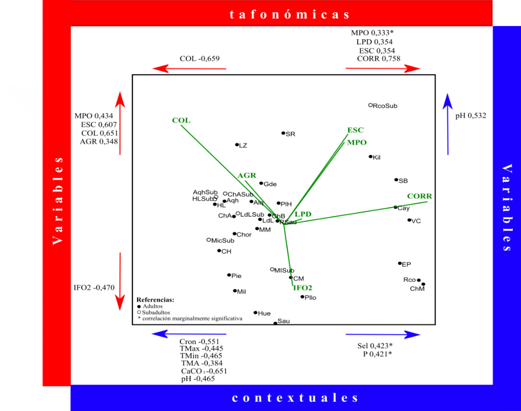 El ordenamiento multivariado de los sitios muestra una dispersión compatible con diferentes tipos de preservación (Figura 2). Esta observación coincide con el hallazgo de diferencias significativas en las VT entre sitios (PERMANOVA, p<0,001) calculadas a partir de la matriz de individuos. Se encontraron variables que fluctúan de manera asociada. Las correlaciones significativas y positivas se dieron entre pérdida ósea-corrosión (r = 0,48; p = 0,004), líneas dendríticas-escamación (r = 0,409; p = 0,016), líneas dendríticas-IFO2 (r = 0,398; p = 0,02), agrietamiento-escamación (r = 0,375; p = 0,029), y agrietamiento-IRO (r = 0,343; p = 0,047), y significativas y negativas entre: pérdida ósea-IFO2 (r = -0,534; p = 0,001), líneas rectas y paralelas-IFO2 (r = -0,386; p = 0,024), cambios en el color-corrosión (r = -0,369; p = 0,032), y corrosión-IRO (r = -0,434; p = 0,01). Entre las VT utilizadas para ordenar los sitios, todas menos IRO y líneas rectas y paralelas presentan correlaciones significativas con alguno de los ejes (i.e., aportan significativamente al ordenamiento) (Figura 2). El eje 1 presenta una correlación significativa y positiva con líneas dendríticas (r = 0,354; p = 0,040), escamación (r = 0,354; p = 0,040) y corrosión (r = 0,758; p = 0,000), y significativa y negativa con cambios en el color (r = -0,659; p = 0,000). En tanto que el eje 2 presenta una correlación significativa y positiva con pérdida ósea (r = 0,434; p = 0,010), cambios en el color (r = 0,651; p = 0,000), agrietamiento (r = 0,348; p = 0,044) y escamación (r = 0,607; p = 0,000), y significativa y negativa con IFO2 (r = 0,470; p = 0,005). Se observó una dispersión de sitios a lo largo del eje horizontal, relacionada principalmente con un incremento de la corrosión hacia la derecha del gráfico. Los sitios Rco, Mil, SB, Cay, VC, EP y ChM conforman un agrupamiento caracterizado por altos niveles de corrosión, escamación, pérdida ósea y líneas dendríticas. Los sitios ubicados en la parte superior del gráfico se caracterizan por altos valores de cambios en el color y escamación especialmente, y en menor medida, de pérdida ósea y agrietamiento, cuyas correlaciones, si bien fueron significativas, son bajas. Los sitios distribuidos hacia la parte inferior del gráfico presentaron valores altos de IFO2 (i.e., niveles bajos de fragmentación).