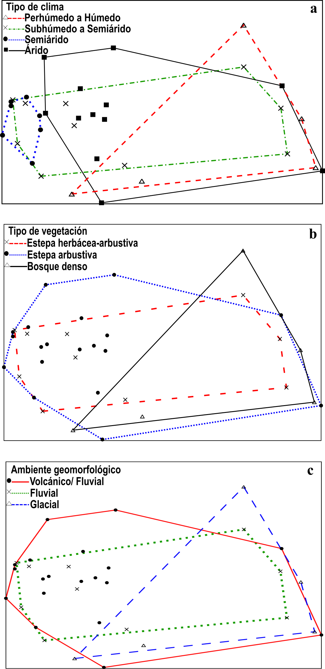 A lo largo del eje horizontal del ordenamiento de sitios se observó una variación significativa con respecto al clima (Kruskall Wallis, p = 0,002; Figura 3a), vegetación (ANOVA, p = 0,036, particularmente entre Estepa arbustiva y Bosque denso; Tuckey p = 0,024) (Figura 3b) y geomorfología (ANOVA, p = 0,037, particularmente entre fluvial y glacial; Tukey p = 0,024) (Figura 3c). Estas diferencias permiten identificar, hacia la izquierda, un conjunto de sitios con bajos valores de pérdida ósea, IFO2, escamación, agrietamiento y cambios en la coloración, en coincidencia con climas áridos a semiáridos, en zonas de estepa arbustiva o herbácea arbustiva y de ambientes volcánico-fluviales. Hacia la derecha, se observa otro conjunto de sitios con altos valores de pérdida ósea, líneas dendríticas, escamación y corrosión y bajos de cambios en la coloración, en coincidencia con climas húmedos a perhúmedos, en zonas de vegetación densa y de ambientes glaciares.