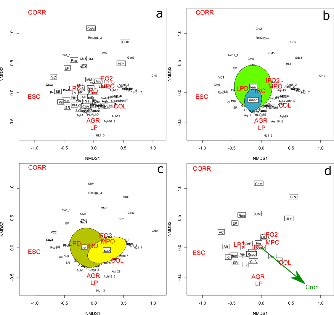 El ordenamiento multivariado con nMDS para los individuos fue significativo para las variables incluidas sitio, sexo, edad y cronología (función envfit del paquete vegan, p<0,001 en los cuatro casos). Los sitios presentan una importante dispersión en el análisis (Figura 4a), con algunos de ellos relacionados con mayores niveles de corrosión, como Rco, ChM, EP, VC y otros. Aqh y HL, en el sector opuesto, se caracterizan por altos valores de cambios en la coloración, agrietamiento y líneas rectas y paralelas y bajos valores de corrosión. Los especímenes femeninos están desplazados hacia la parte superior del gráfico, asociados con mayores valores de corrosión y menores de agrietamiento y líneas rectas y paralelas (Figura 4b). No obstante la significancia de sus diferencias, la superposición entre las elipses es importante. La prueba pareada indicó que no hay diferencias entre masculinos y femeninos (p = 0,264), por lo que la significancia se explica por la incidencia de indeterminados y no determinados. En la Figura 4c se puede observar que los adultos se encuentran desplazados con respecto a los subadultos hacia mayores valores de corrosión, escamación y líneas dendríticas. Finalmente, la variable cronología, también significativa, se asocia a los niveles más bajos de corrosión, y altos de agrietamiento, líneas paralelas y cambios en la coloración, característicos de sitios como Aqh y HL (Figura 4d).