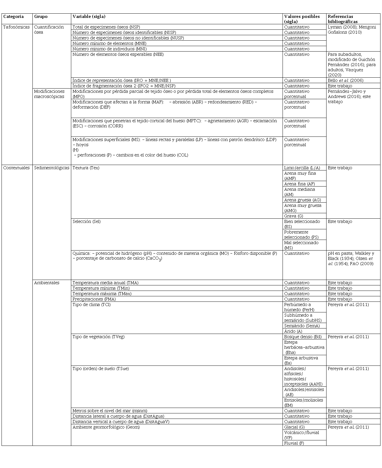 Se evaluó la presencia de doce variables, organizadas de acuerdo con cuatro tipos de modificaciones (Fernández-Jalvo y Andrews, 2016) (Tabla 2): 1) las modificaciones por pérdida ósea (MPO), referidas a la destrucción parcial del tejido así como a la pérdida total de un elemento óseo; 2) las modificaciones que afectan la forma (MAF), tales como abrasión (ABR), pulido o redondeamiento (RED) o deformación (DEF); 3) las modificaciones que penetran el tejido cortical (MPTC), que incluyen el agrietamiento (AGR), escamación (ESC), que es la pérdida de tejido óseo que resulta en la exposición de hueso subperiostial a diferentes profundidades, y corrosión (CORR), esta última referida a aquellas modificaciones superficiales por acción de agentes químicos; y 4) las modificaciones superficiales (MS), que incluyen líneas rectas y paralelas (LP), líneas con patrón dendrítico (LPD), referidas a un patrón de ramificación irregular, hoyos (H), perforaciones (P) y cambios en el color del hueso (COL). Todas las modificaciones se relevaron a ojo desnudo, con lupa de mano y de pie con luz fría (con aumento de hasta 10X), y se cuantificaron de acuerdo con el porcentaje de superficie del hueso afectada: 0%, 1-25%, 26-50%, 51-75% y 76-100%.