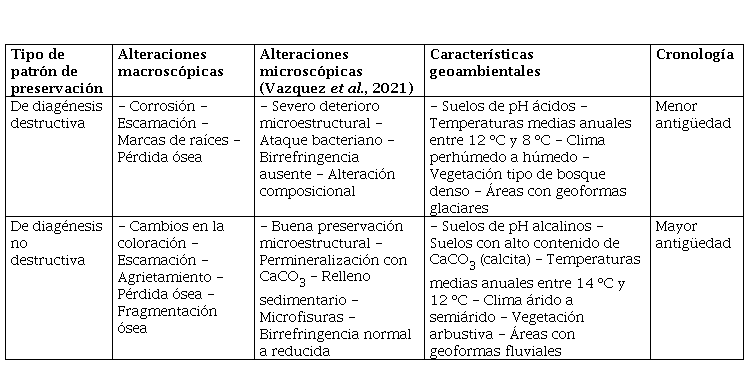 Se identificaron dos patrones de preservación tafonómicos, asociados con características geoambientales definidas, en un espacio multivariado complejo. El patrón denominado de diagénesis destructiva está caracterizado por sitios con restos mal preservados, en climas húmedos de pH ácido y bajas temperaturas, que no superan pocos cientos de años de antigüedad. Por su parte, los sitios del patrón de diagénesis no destructiva se caracterizan por un grado menor de deterioro y mayor persistencia ósea dentro de la matriz sedimentaria, en climas típicamente áridos, de pH alcalino y temperaturas más altas.