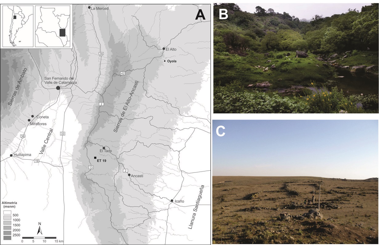La sierra de El Alto-Ancasti es un cordón montañoso que se dispone al este de la provincia de Catamarca (Argentina) (Figura 1). Su ladera occidental desciende abruptamente, mientras que la ladera oriental lo hace de modo suave, lo que da lugar a la conformación de tres pisos ecológicos, dos de los cuales concentraron nuestras investigaciones.