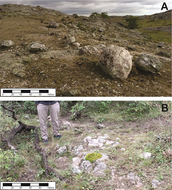 La tecnología lítica analizada en los cuatro sitios considerados se caracterizó por el uso de cuarzo como materia prima en altísima proporción (96%). El restante 4% está representando por cuarcita, filita y sílices. En las dos áreas de estudio (Oyola y El Taco), se identificaron afloramientos de cuarzo pegmatítico xenomorfo a pocos metros de los sitios arqueológicos, por lo que se considera una materia prima de muy simple acceso. Sin embargo, existe una diferencia significativa, vinculada con el tamaño de los nódulos. En el caso de El Taco, se observan afloramientos de grandes dimensiones y con bloques de cuarzo de tamaños muy variables, incluso algunos de más de 80 cm de diámetro (Moreno, 2015). En Oyola, el cuarzo se encuentra en afloramientos mucho más pequeños, dispersos en el paisaje y con nódulos de dimensiones relativamente pequeñas, menores de 20 cm de diámetro y además, obstruidos por la frondosa vegetación (Egea y Moreno, 2021) (Figura 2).