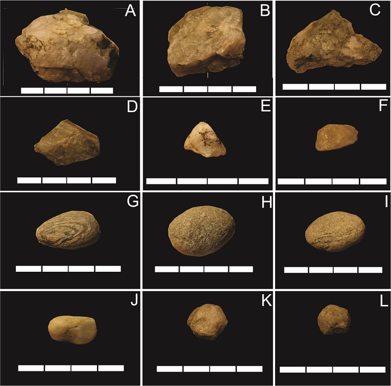 Para la realización del análisis experimental utilizamos 22 nódulos de cuarzo xenomorfo, con los que se efectuaron 27 experimentos, ya que en algunos casos fueron alternados entre las distintas técnicas de percusión. Los nódulos fueron recolectados en fuentes de aprovisionamiento de El Taco y Oyola, y presentan formas irregulares y tamaños variables (Figura 4). En relación con los percutores, se utilizó el cuarzo, seleccionado en las canteras antes comentadas, y también rodados de esquisto y granito.
