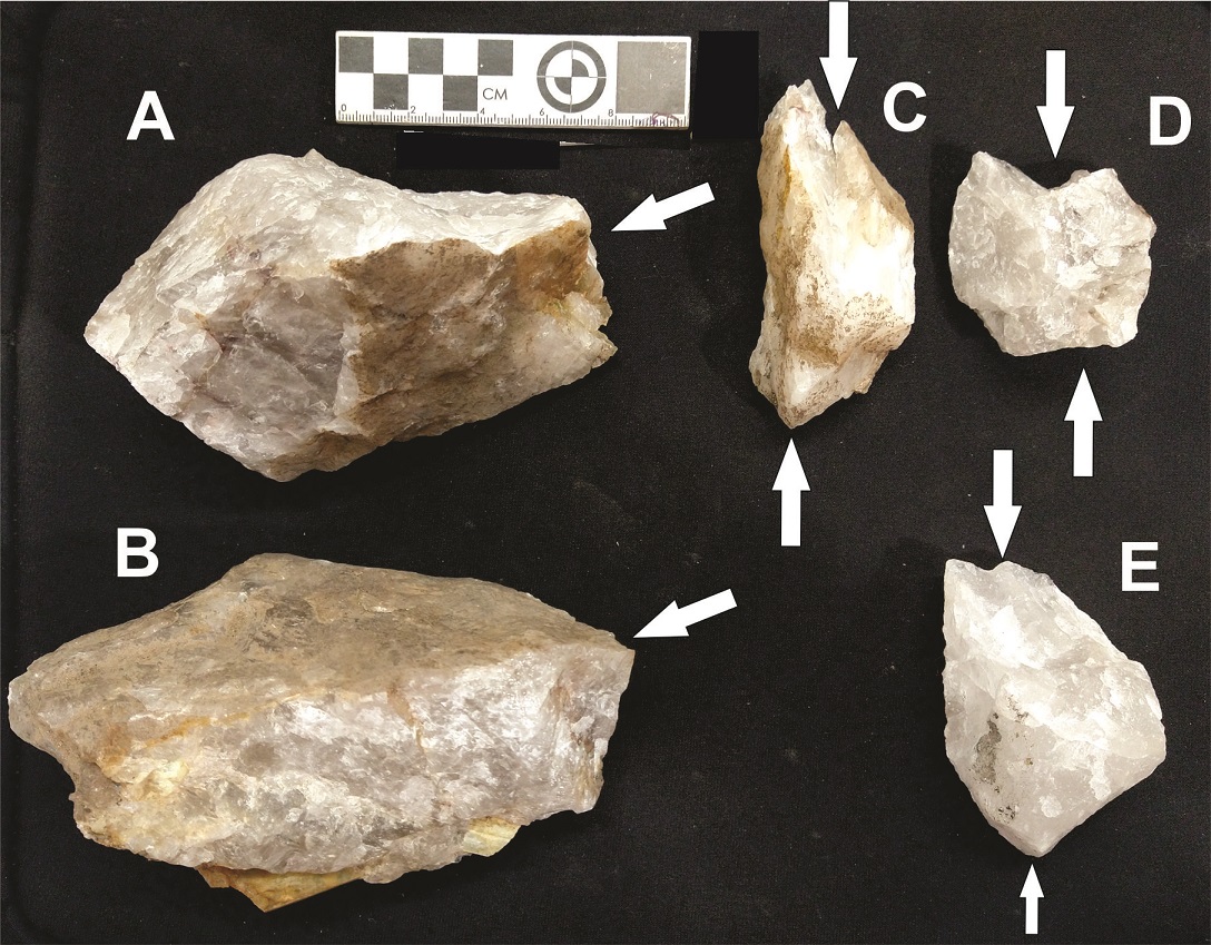 El cuarzo ha sido utilizado frecuentemente para la manufactura de instrumentos líticos en diferentes momentos históricos y contextos geográficos de todo el mundo. Sin embargo, presenta cierta dificultad para controlar el proceso de reducción, debido a su anisotropía, la presencia de inclusiones y su fractura concoidal imperfecta (Mourre, 1996; Spott, 2005; Rodríguez Rellán, 2015). Esta situación resulta en problemas para aquellos que estudiamos esta tecnología, principalmente en la variedad xenomorfa de este mineral (Rodríguez Rellán, 2015), dados por la ausencia o muy baja frecuencia de rasgos diagnósticos, como estrías, bulbos, etc., que permitan no solo la identificación de las actividades de talla, sino incluso el registro de estos materiales como resultado de la acción humana, ya que no siempre se ajustan a parámetros técnicos usados generalmente en los estudios de tecnología lítica de otras materias primas (Fábregas Valcarce y Rodríguez-Rellán, 2008; Pautassi y Sario, 2014; Moreno et al., 2022, entre otros).